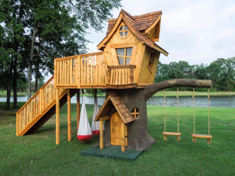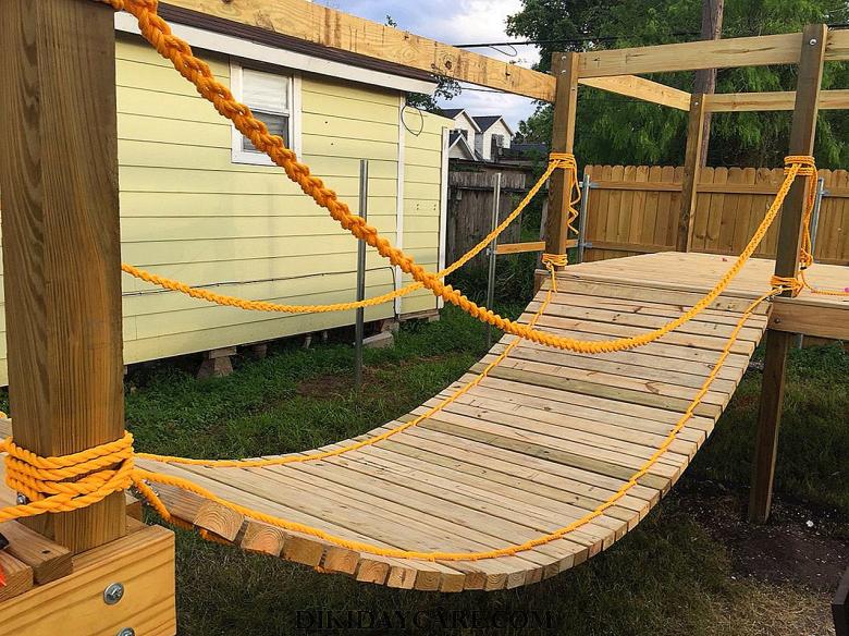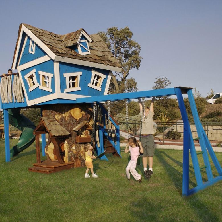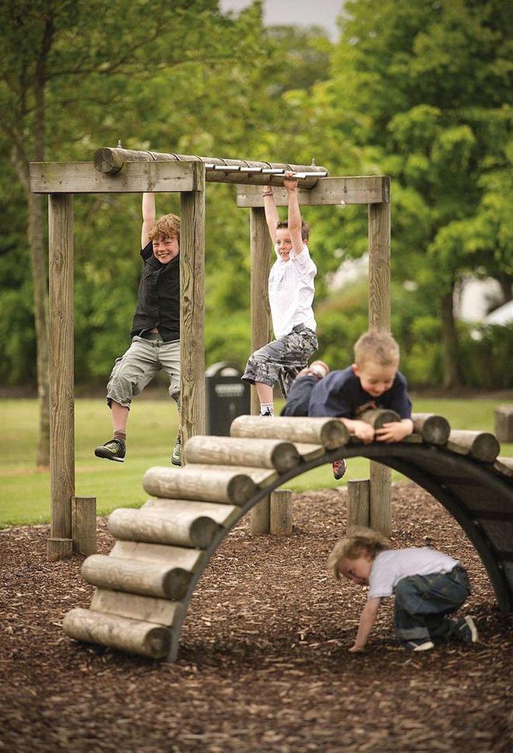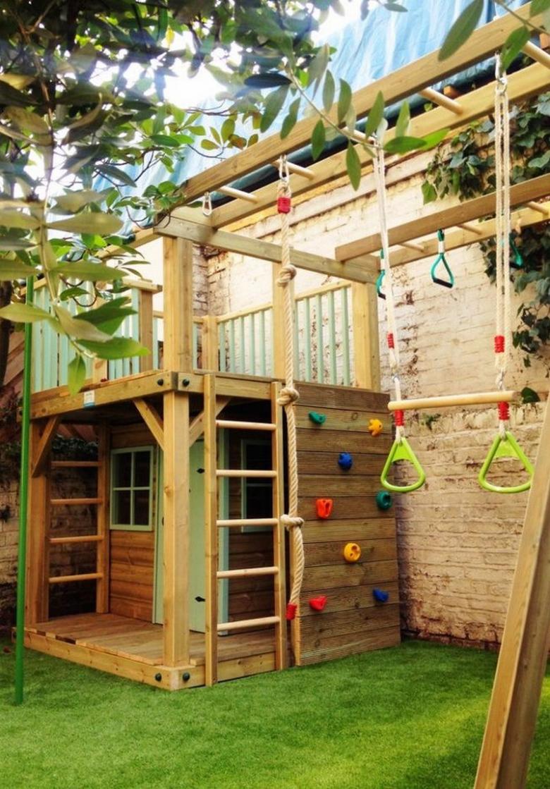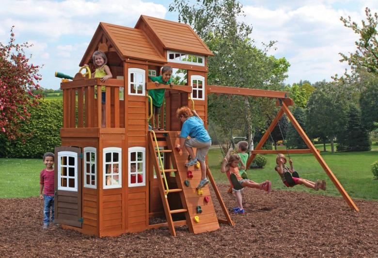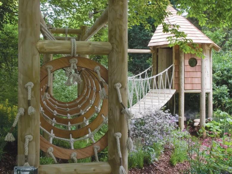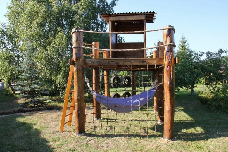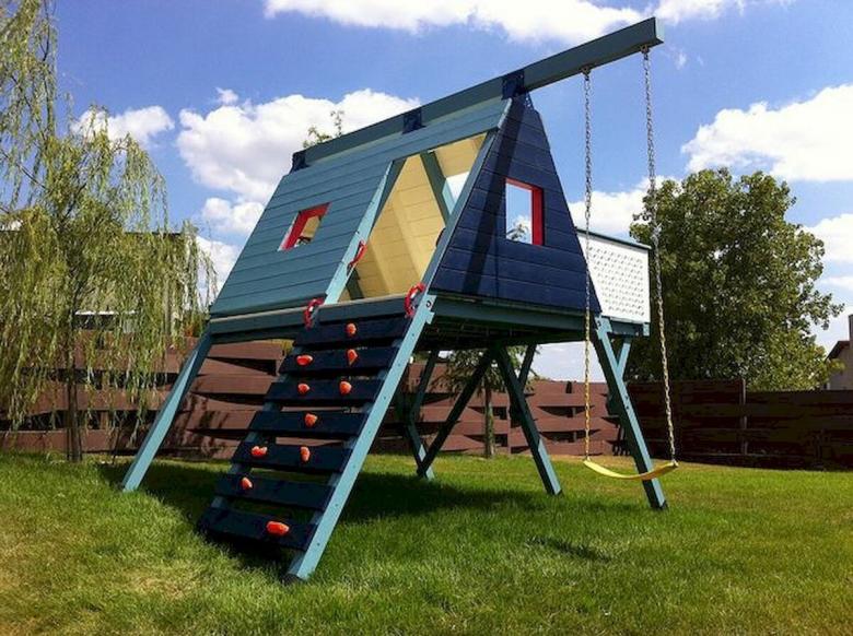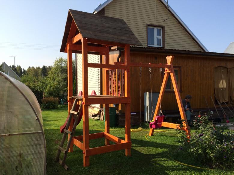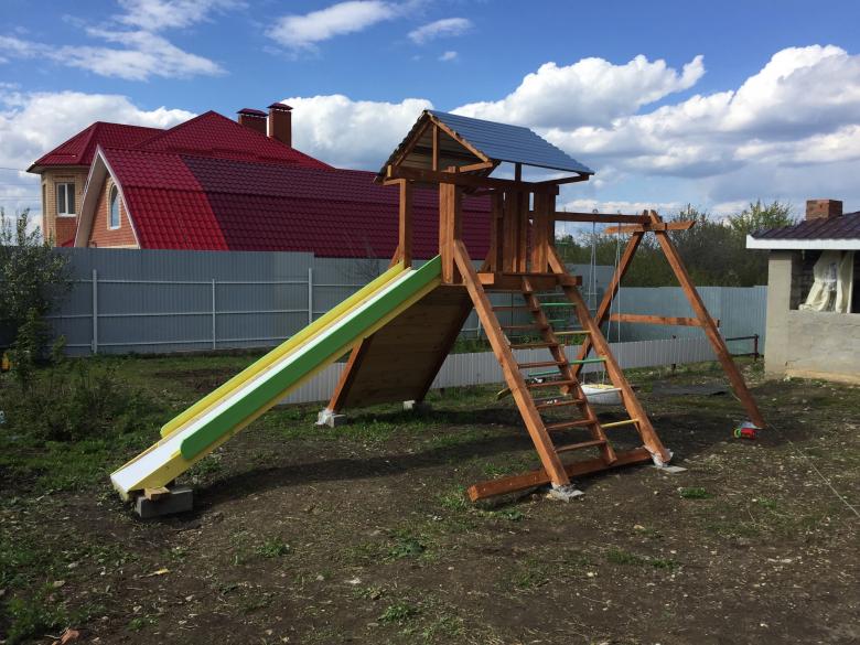 Le plus souvent créé terrain de jeu en bois fabriqué de leurs propres mains. Les éléments supplémentaires peuvent être de vieux pneus de voiture ou des cordes tendues.