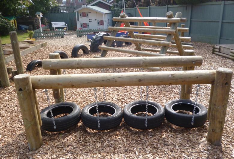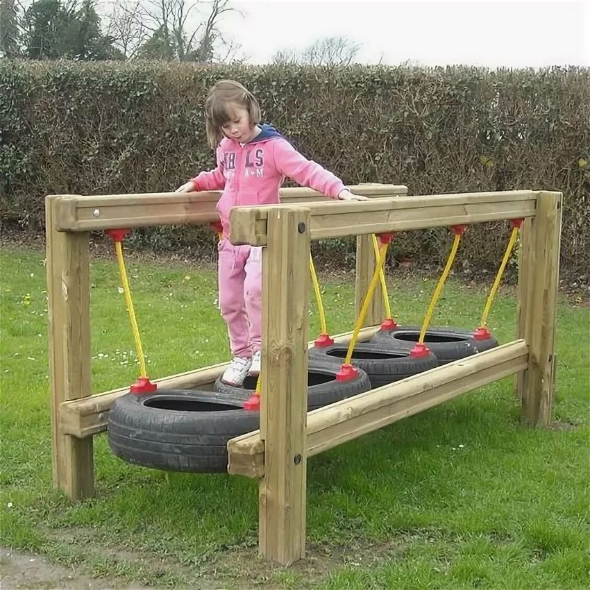 Utilisez généralement des pneus pour le parcours d'obstacles (ils peuvent être peints de différentes couleurs). Mais une toile d'araignée de cordes, des rondins suspendus, un chemin de cordes, divers poteaux, des pneus enterrés verticalement, des cerceaux de gymnastique et des cordes élastiques sont bien plus intéressants.