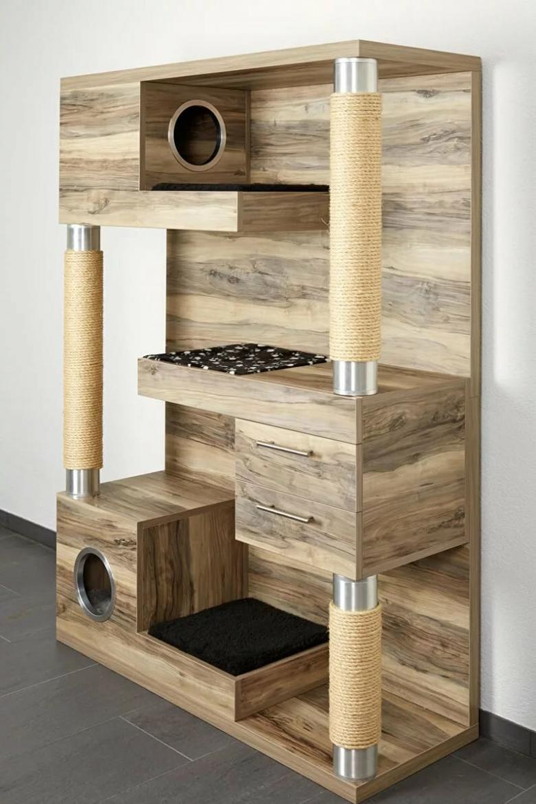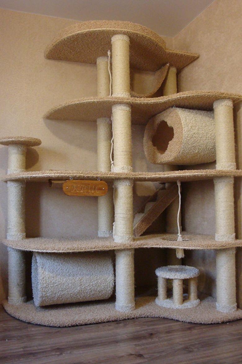 Une solution inhabituelle serait de créer une entrée dans le deuxième tiroir à partir du sol. Dans ce cas, on peut placer un lit d'appoint au rez-de-chaussée pour que le chat puisse s'y reposer sans rentrer à l'intérieur. Cette disposition de la pièce convient aux animaux de compagnie actifs. Les chats âgés auront du mal à se rendre dans leur propre appartement.