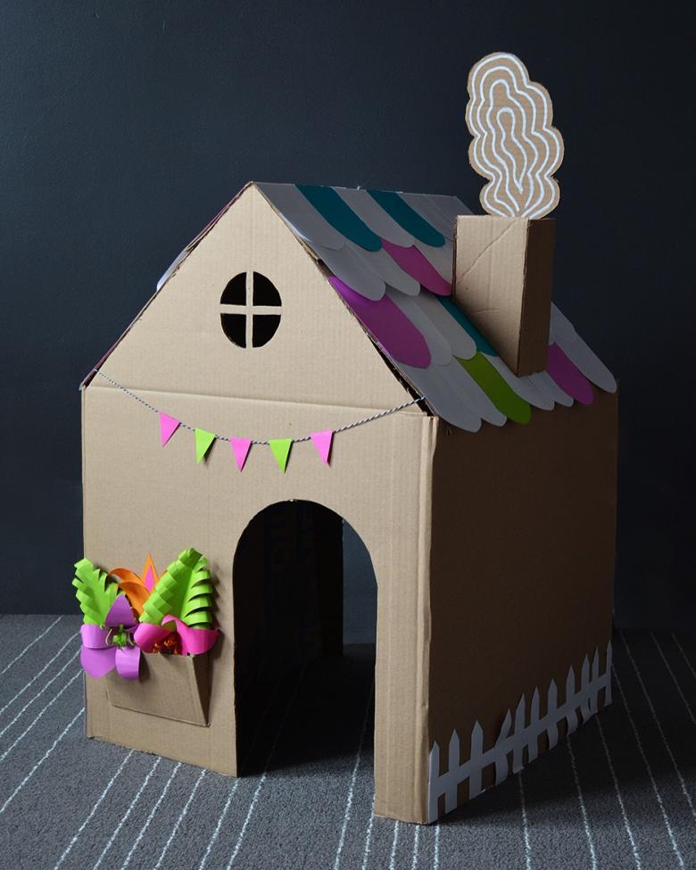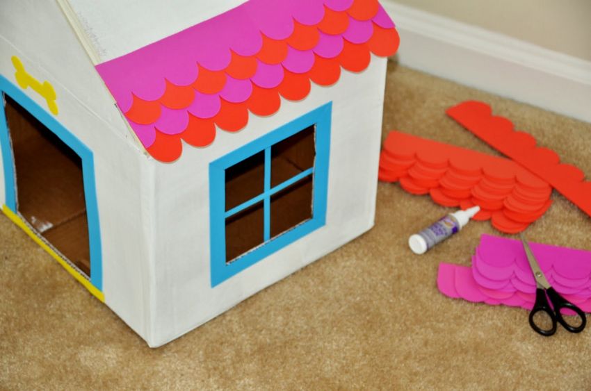 - Utilisez de la colle pour fixer toutes les pièces ensemble. Fabriquez le toit en carton ondulé.