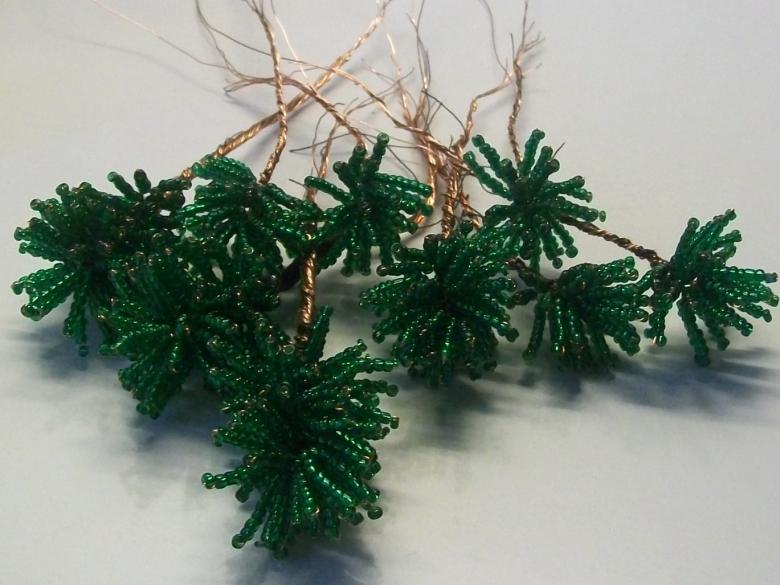 Enfilez ensuite six perles vertes à chaque extrémité du fil et poussez-les jusqu'au sommet du futur "arbre". Fixez ensuite ces perles en tordant les extrémités des fils.