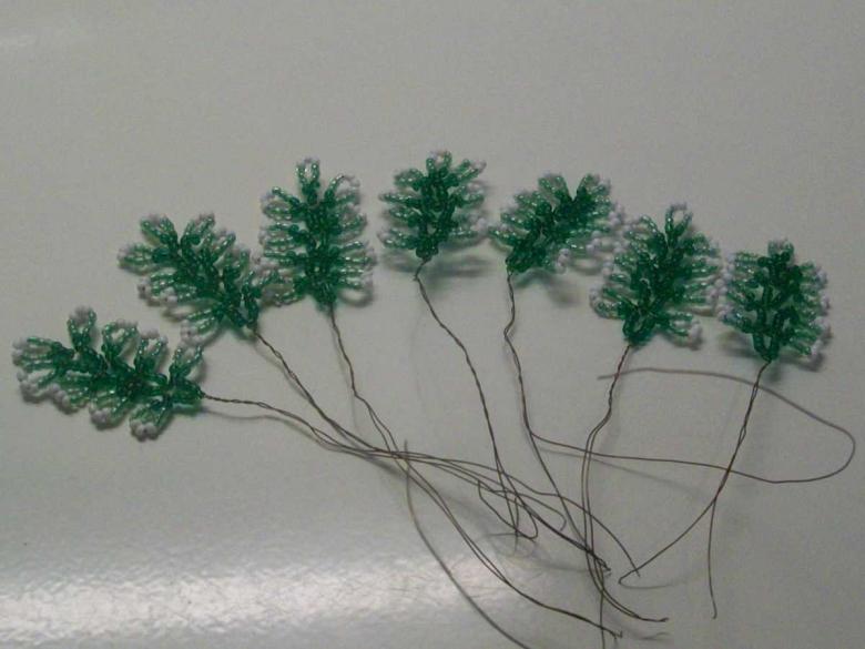 Sur l'une des sections de fil, vous enfilez 9 perles vertes, vous les placez au milieu de la section de fil, puis vous pliez le fil au milieu et le tordez sous les perles. Tu as obtenu la première "patte" et ensuite tu mets à nouveau 9 perles vertes à chaque extrémité du fil, et après cela, tu amènes les perles à la patte et tu plies le fil au milieu des perles et tu le tords plusieurs fois à la base de la nouvelle "patte". On obtient ainsi trois pattes.