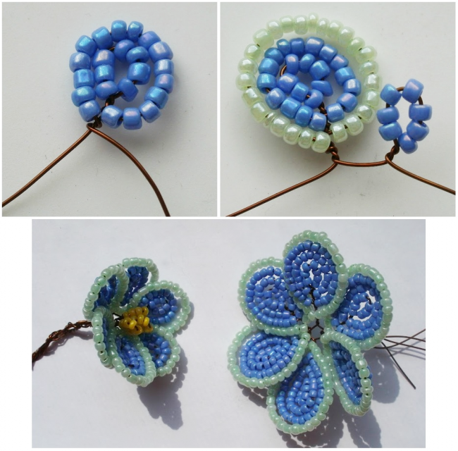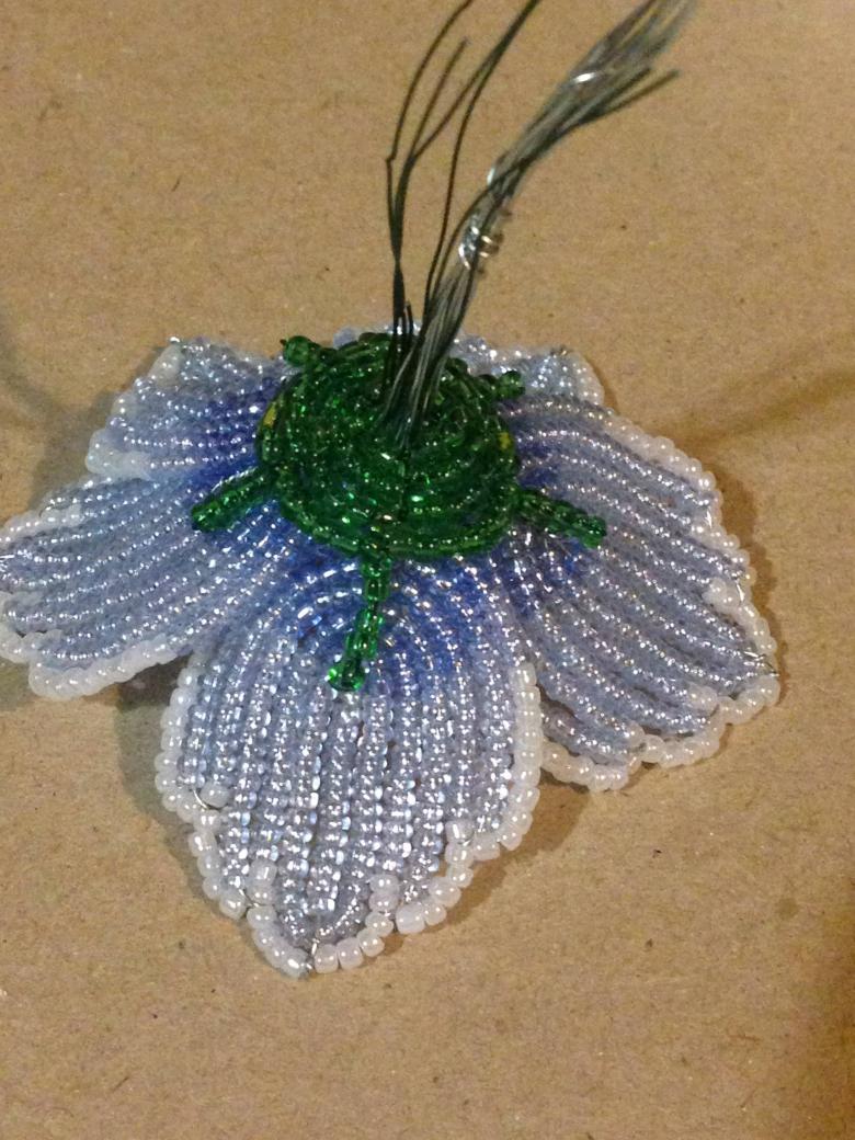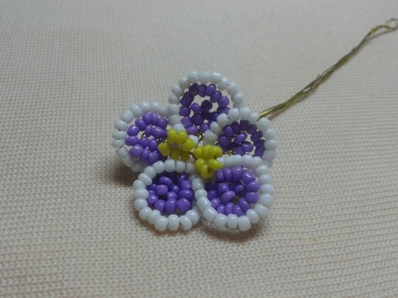 Un pétale est terminé. Sur les bords libres des fils, continuez à enfiler des perles, et en utilisant la méthode ci-dessus, on obtient quatre autres pétales.