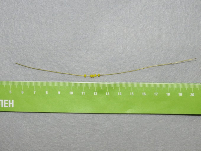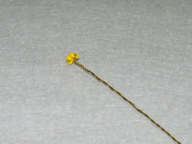 Un morceau de fil de fer et des perles jaunes seront nécessaires pour décorer naturellement le centre du bouton. Ensuite :