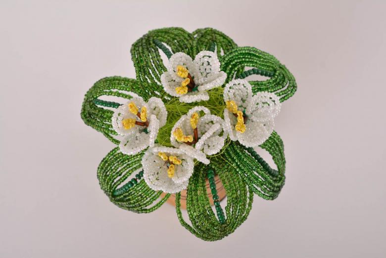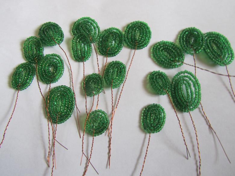 Pour réaliser de petites feuilles, enfilez huit graines vertes sur la base, pliez le fil en arc de cercle et faites une boucle. Dans la deuxième rangée de petites feuilles, nous enfilons tellement de matériel qu'elles finissent par encercler la première rangée.