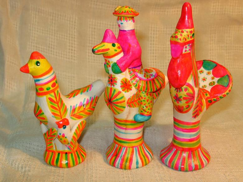 Le jouet musical en argile était porteur d'une certaine image sémantique et d'un effet de magie. La figure féminine était une incarnation de la divinité païenne de la fertilité, la figure d'un cavalier ou d'un cheval symbolisait la divinité du soleil, un cerf symbolisait la richesse et un canard symbolisait l'eau "terrestre et céleste". Pendentifs ou clients magiques : cheval - maison, ours - forêt.