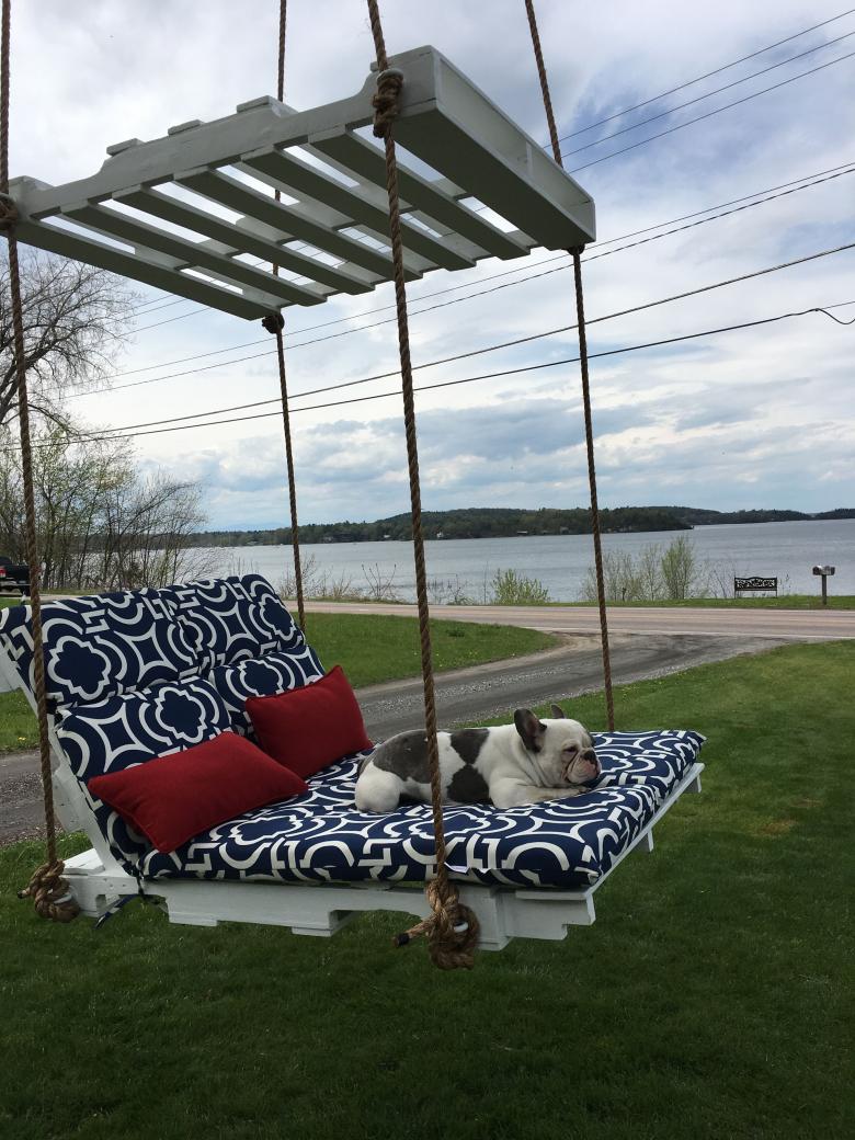 Une seule palette peut être utilisée non seulement pour créer une balançoire, mais aussi pour créer un endroit confortable où se reposer en plaçant un matelas moelleux et des coussins décoratifs ou des poufs doux sur la base suspendue.