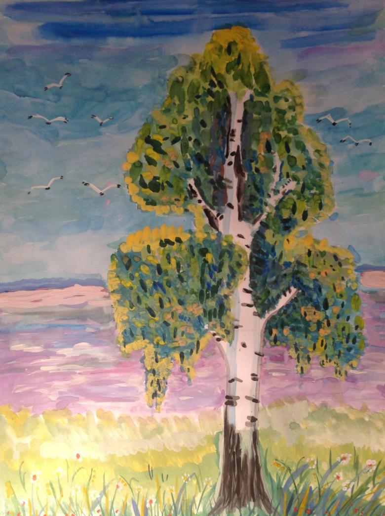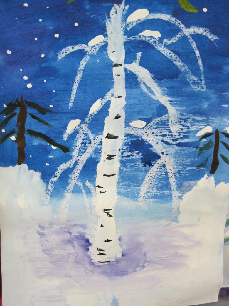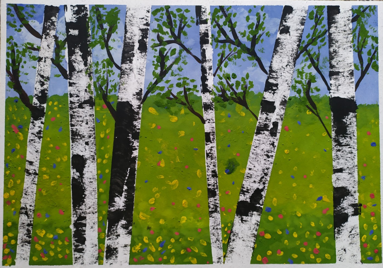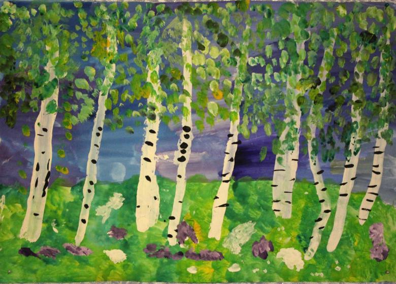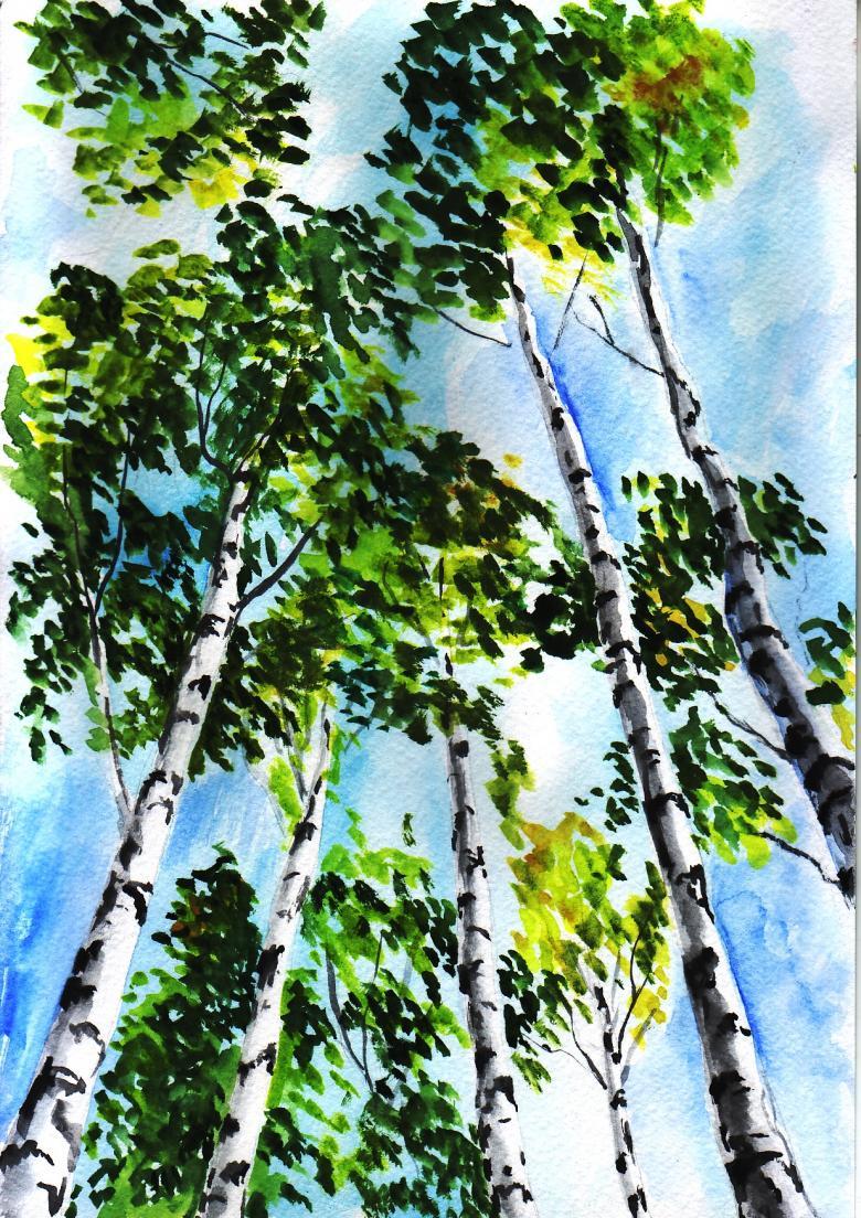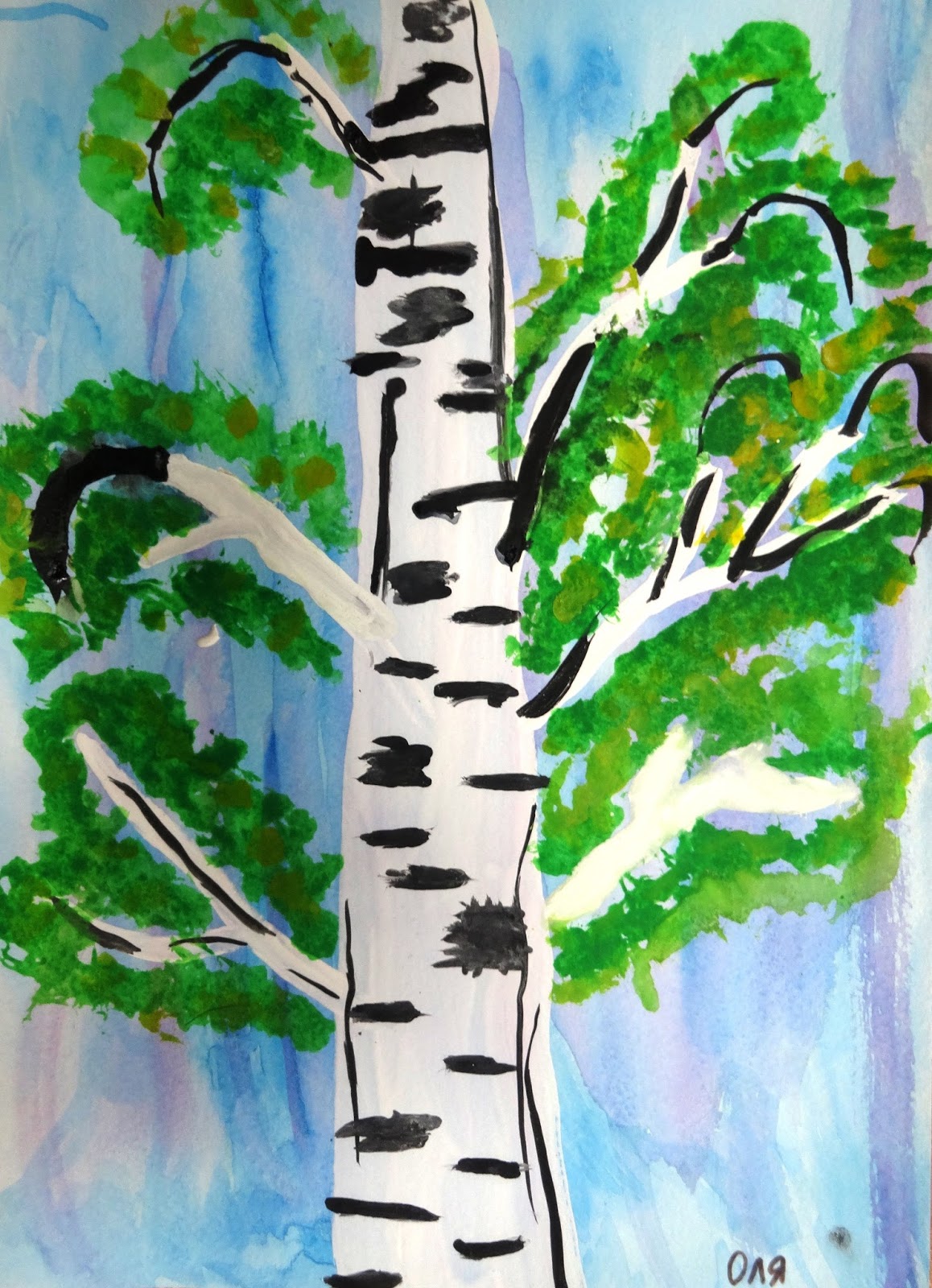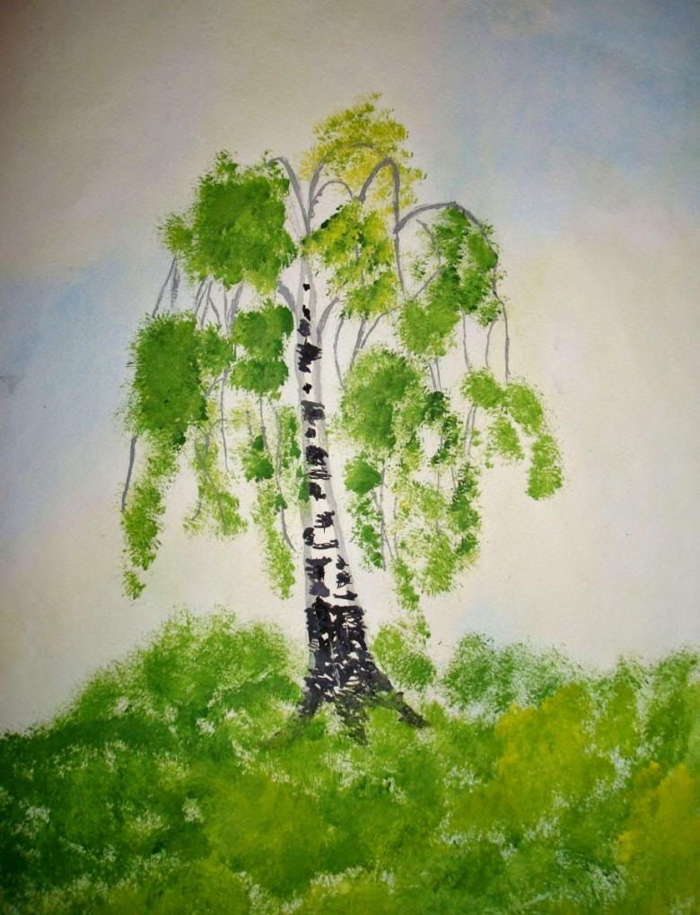 La gouache est très difficile à manier pour les enfants au début. Dessiner un bouleau est particulièrement soigné, car le tronc doit rester blanc.
