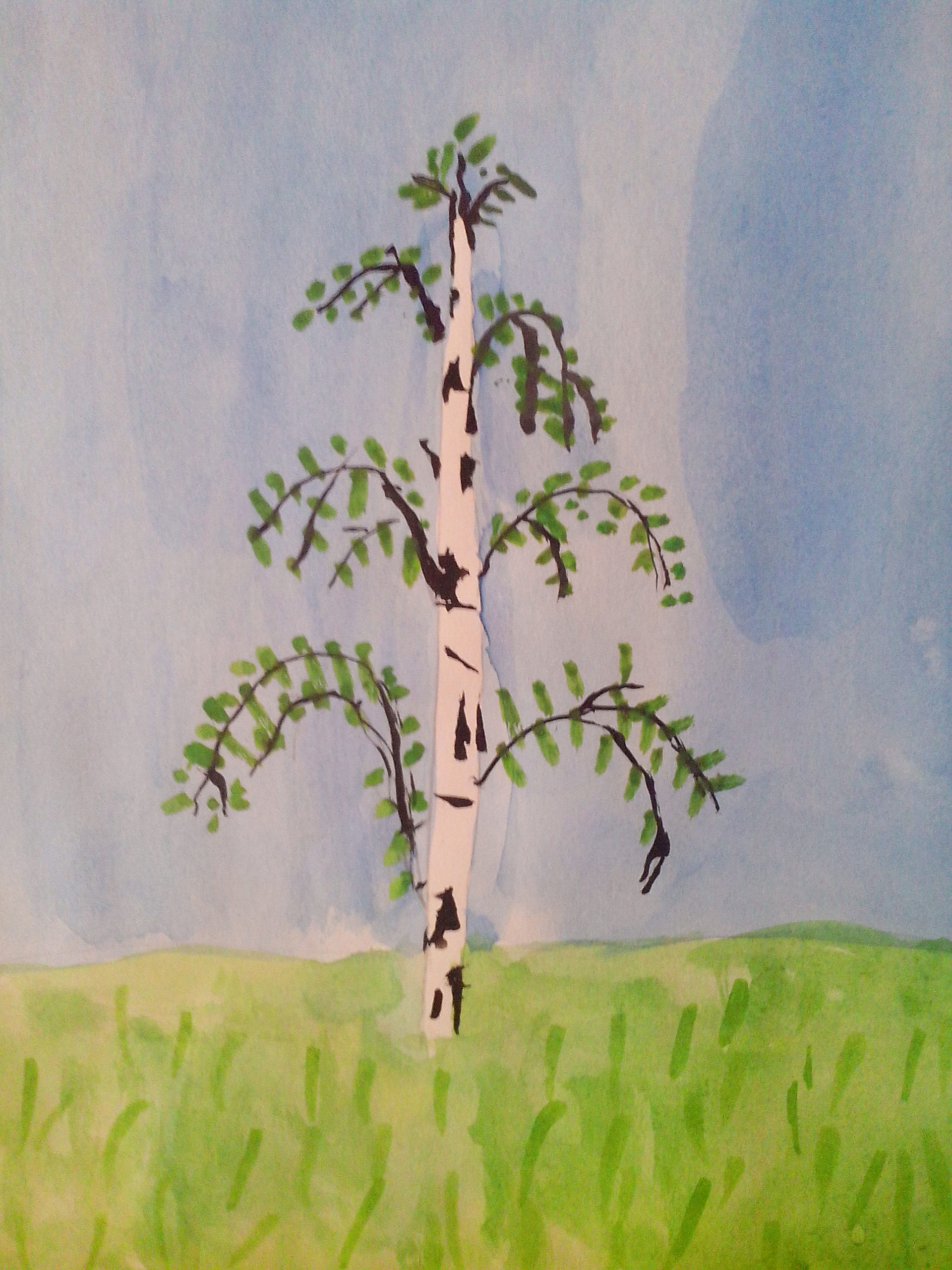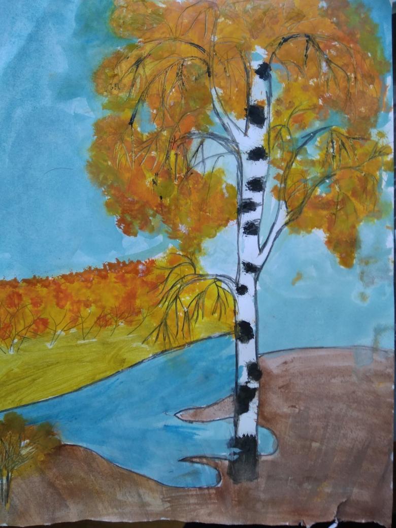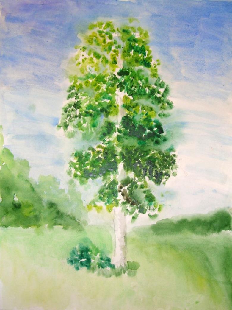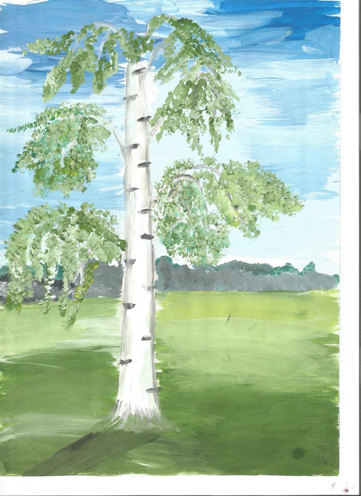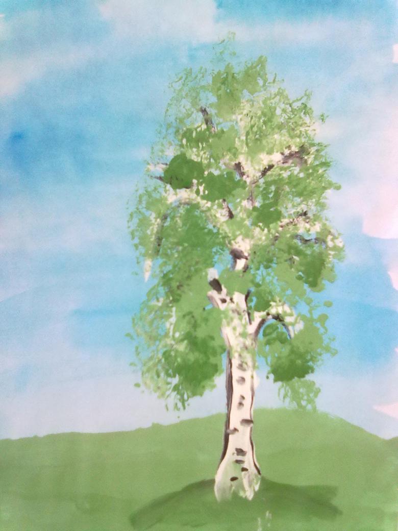 La gouache est très difficile à manier pour les enfants au début. Dessiner un bouleau est particulièrement soigné, car le tronc doit rester blanc.