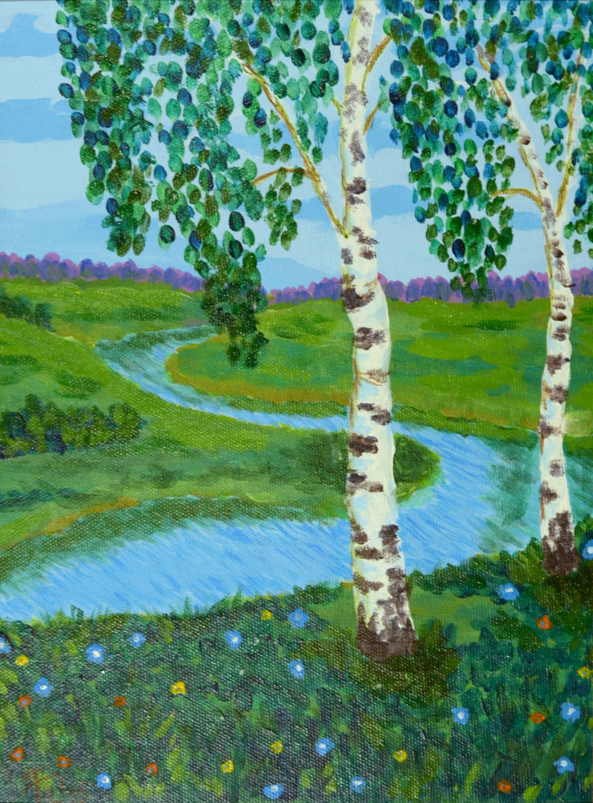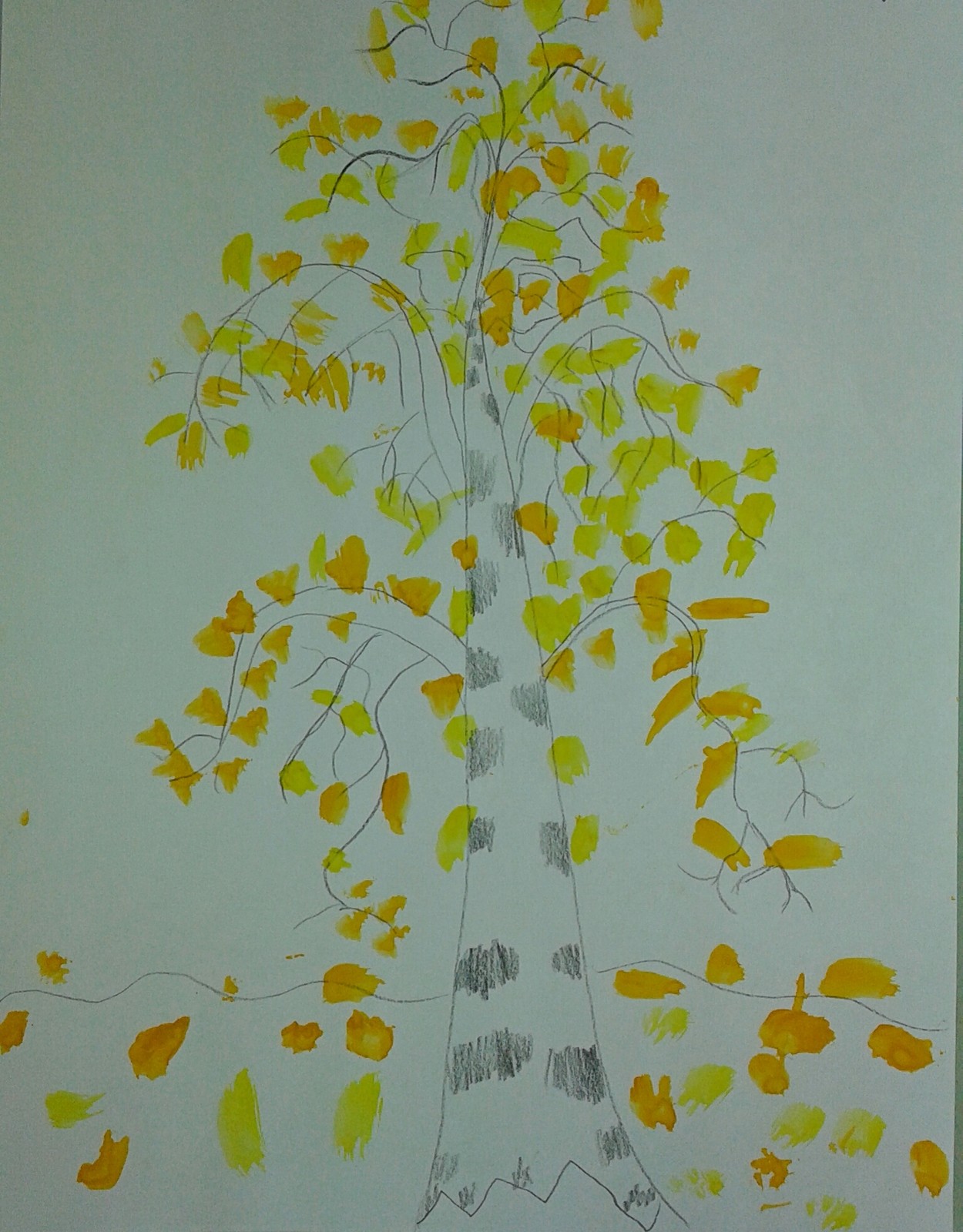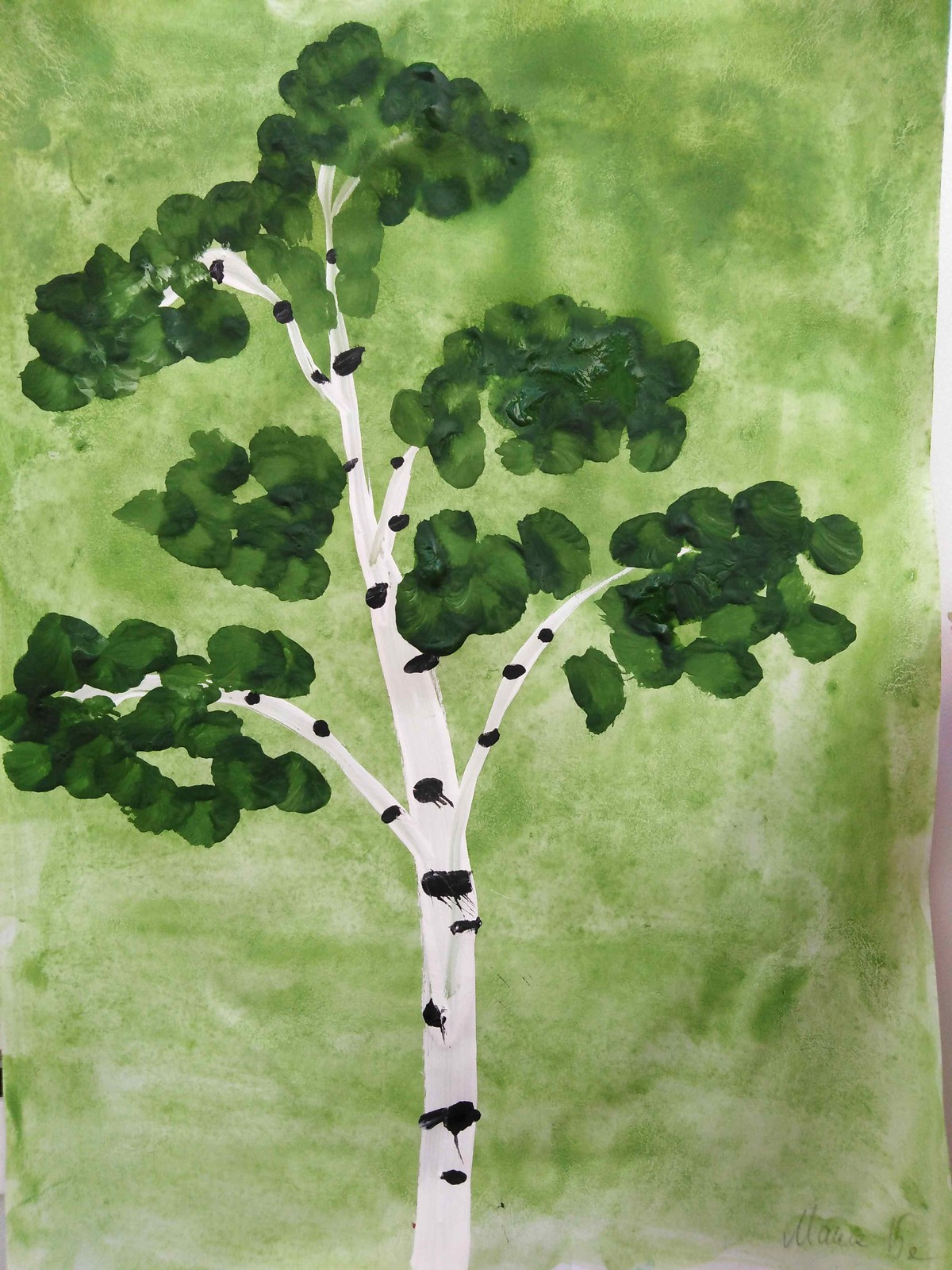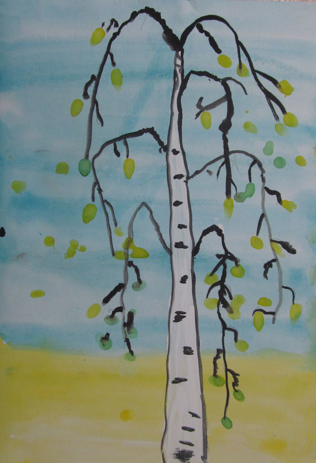 La gouache est très difficile à manier pour les enfants au début. Dessiner un bouleau est particulièrement soigné, car le tronc doit rester blanc.