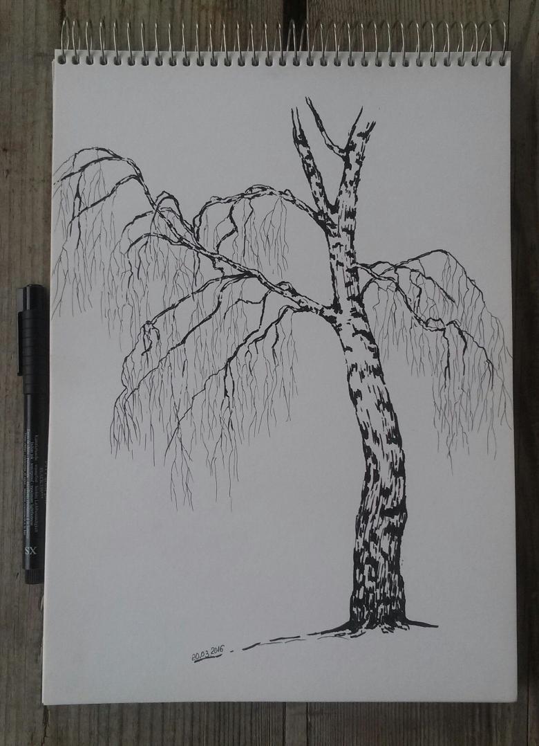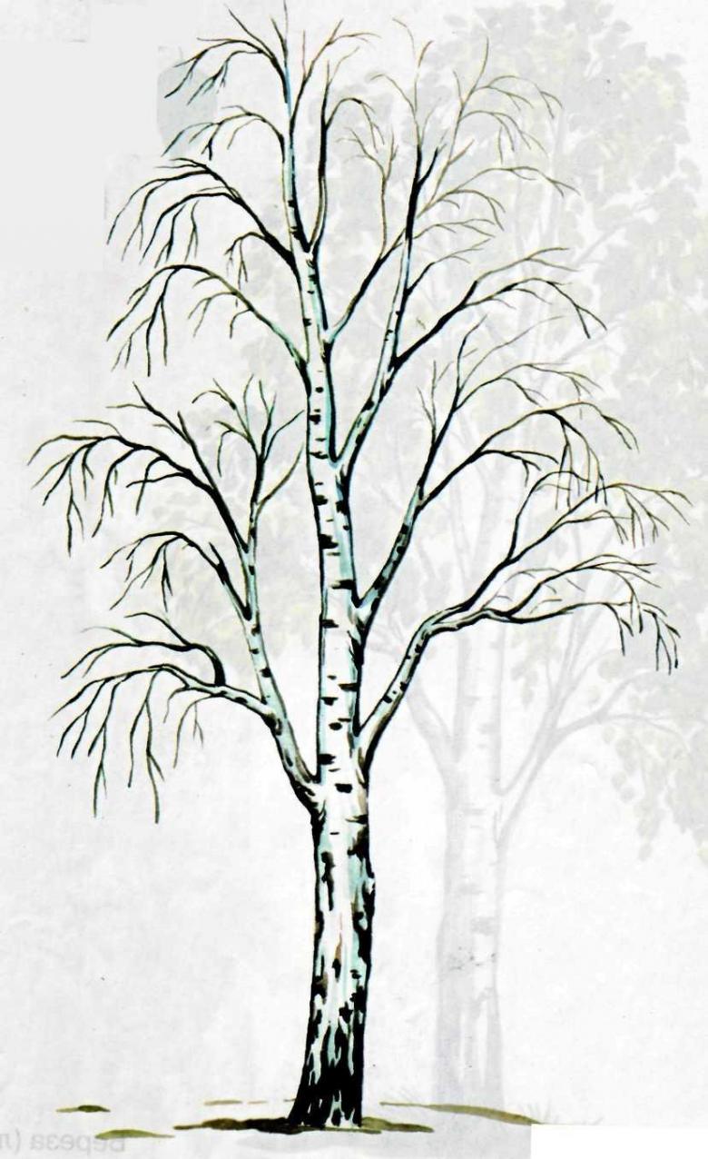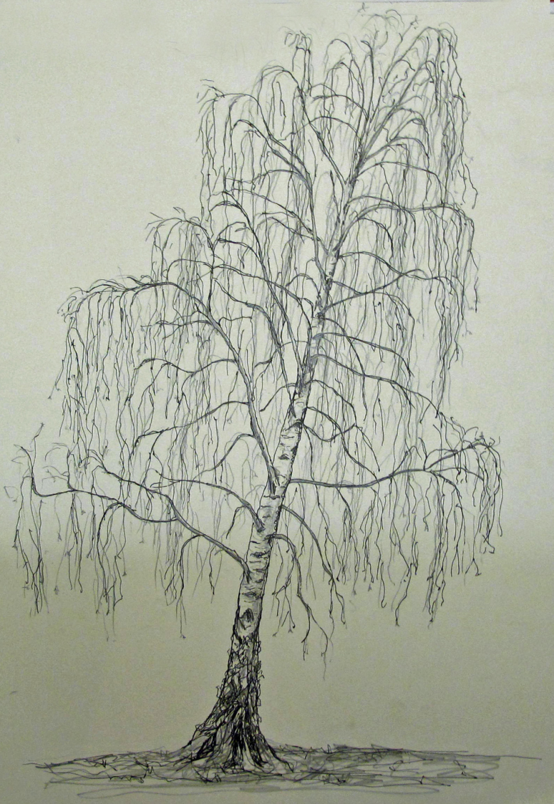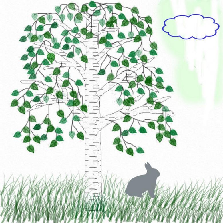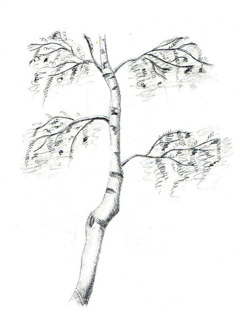 Le tronc avec les branches principales est dessiné en premier. Déjà, de fines branches sont tirées vers eux. Ceux du haut sont dirigés vers le soleil. Et plus on les place bas, plus les branches tombent doucement vers le bas. On dit qu'ils ont une forme pleurante. Plus il y a de petites branches, plus le bouleau sera moelleux.