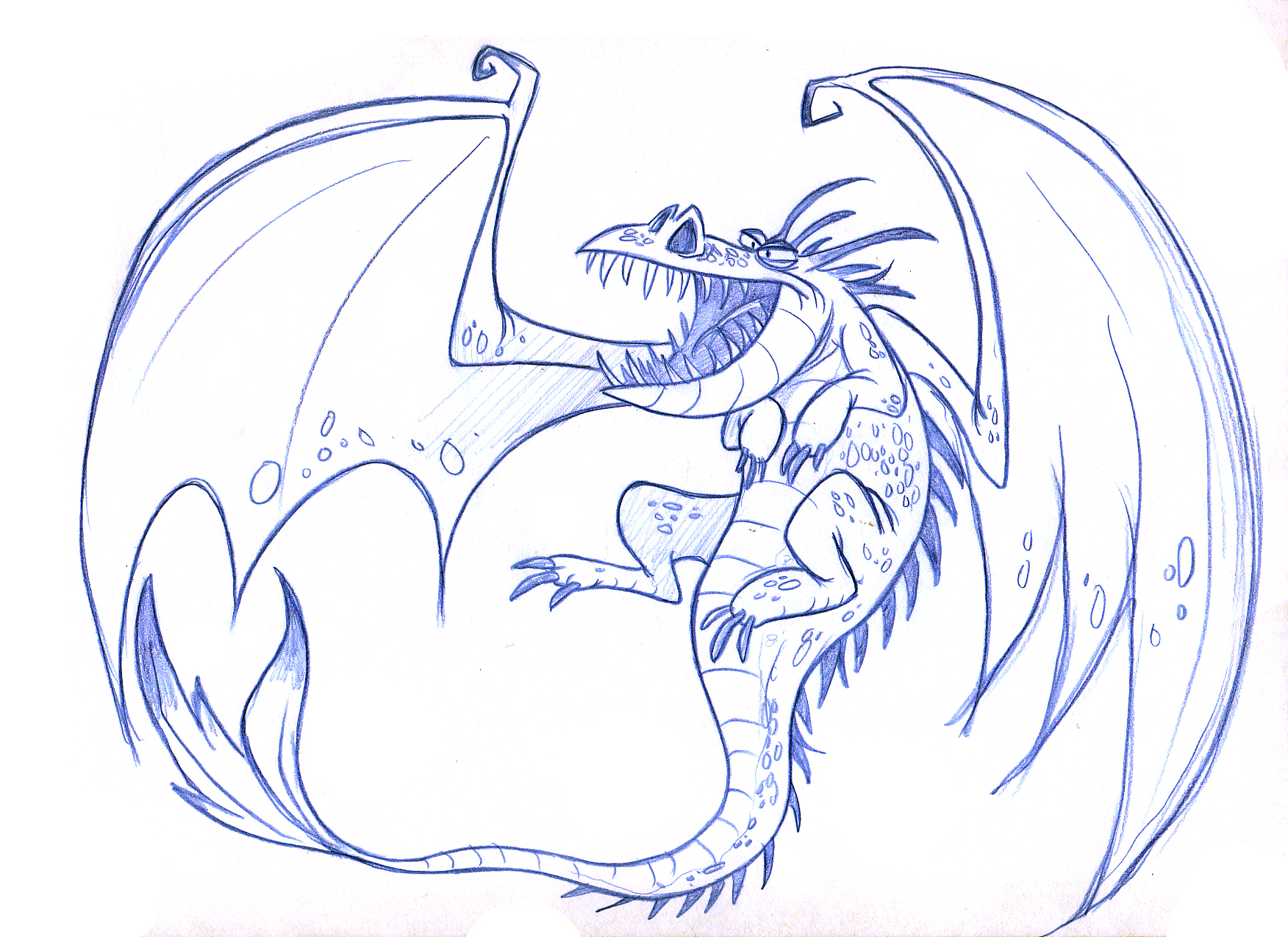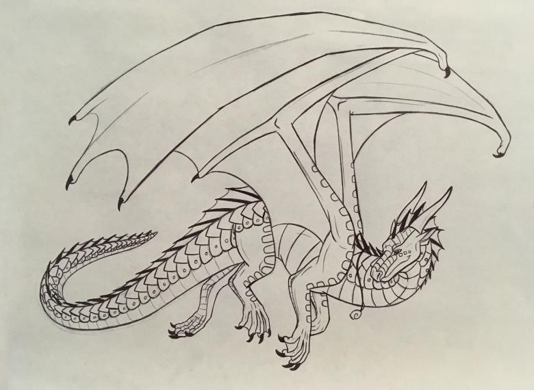 L'abdomen est séparé de la partie principale du corps par un demi-cercle. L'aspect cuiré des ailes est complété par les lignes supplémentaires figurant à l'intérieur. Le dos et la queue doivent être décorés d'une belle crête. Une flamme crachée peut être représentée par la bouche.