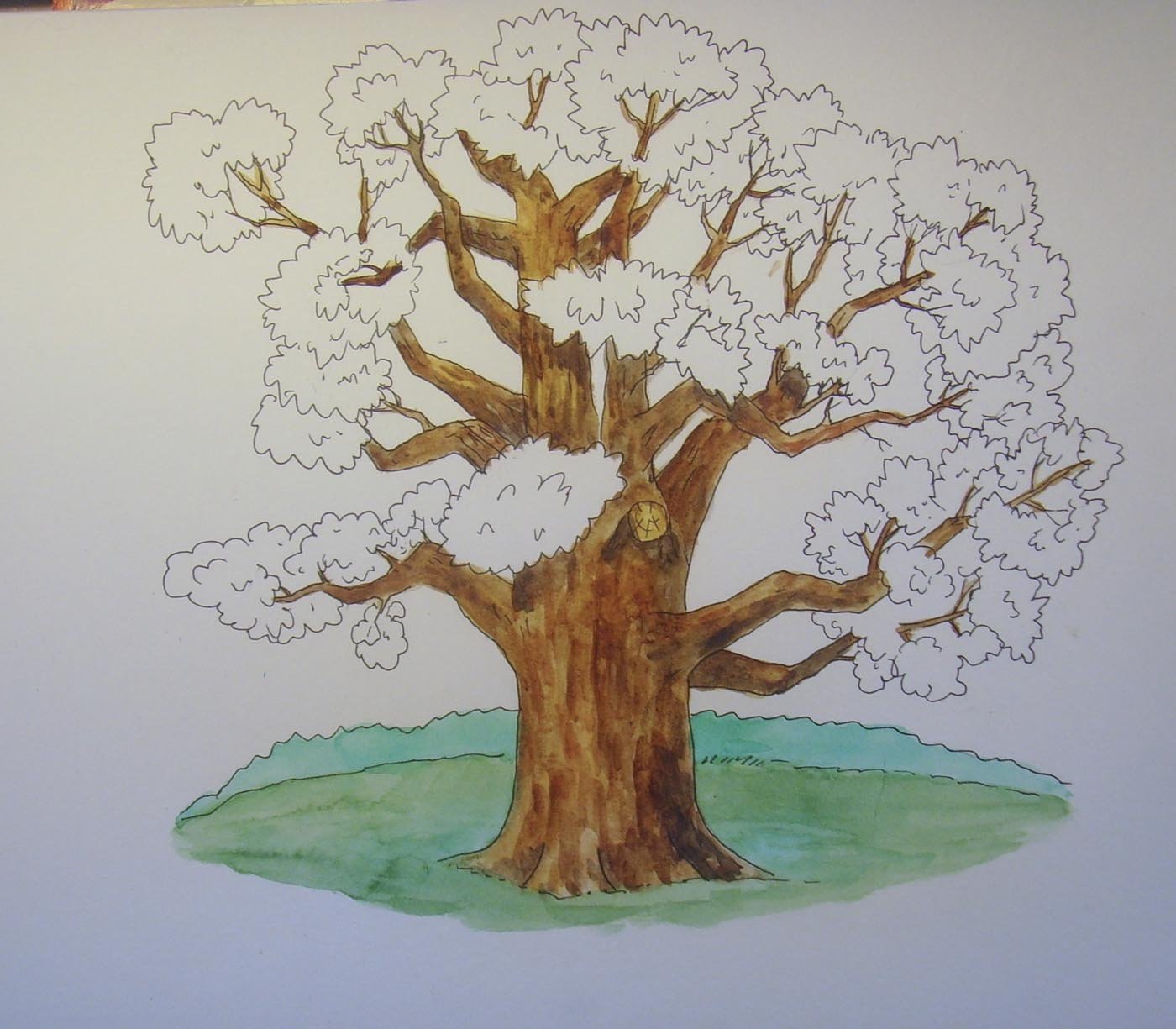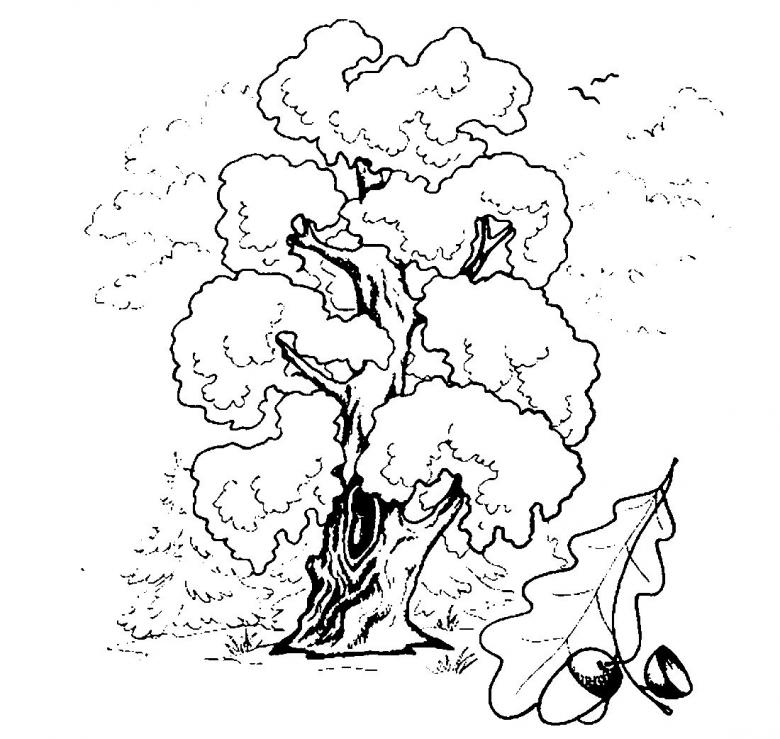 À première vue, la photo d'un chêne de dessin animé ressemble à un arbre ordinaire. Mais il existe des différences significatives. Des branches aux formes complexes apparaissent. La texture de l'écorce est tracée. Il est important que l'enfant comprenne que le chêne est un arbre puissant et bien enraciné.