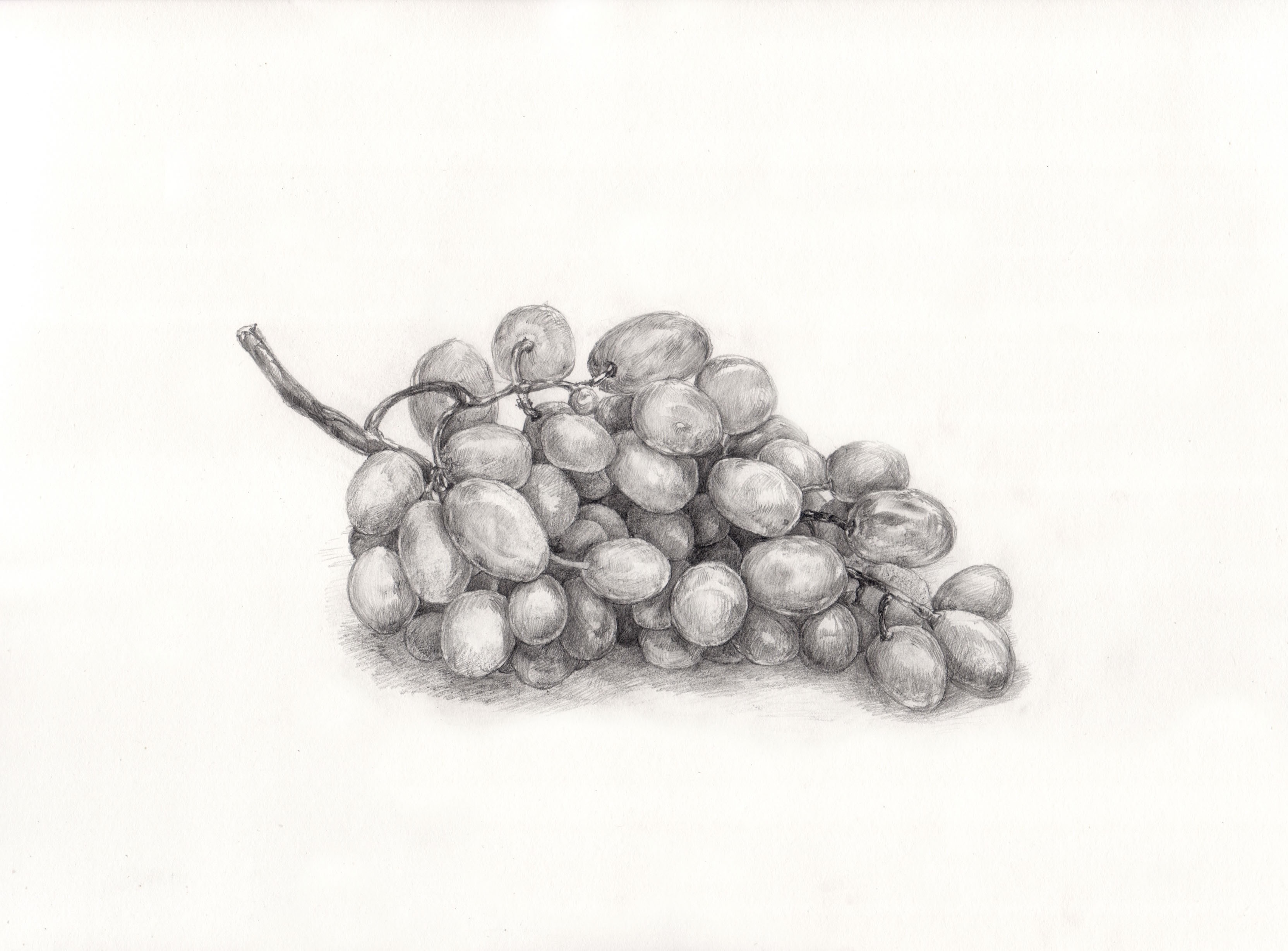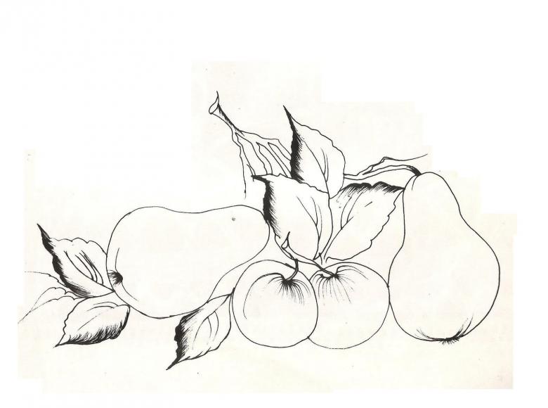 - Le contour de chaque fruit de la nature morte est détaillé. Les lignes conventionnelles sont anéanties. Les tiges sont façonnées.