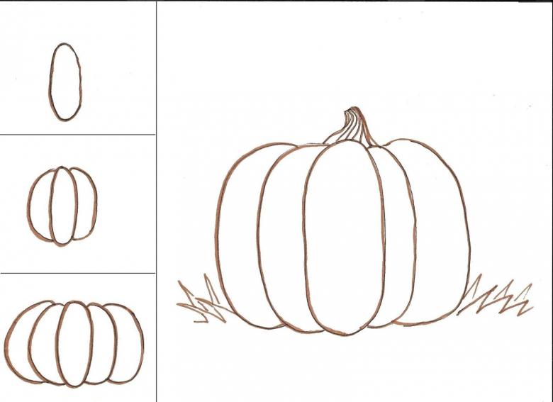 - Un ovale horizontal est dessiné avec des lignes auxiliaires claires. Son allongement détermine la taille du futur panier et sa largeur doit permettre de loger quelques fruits à l'intérieur, car il s'agira du bord supérieur du panier.