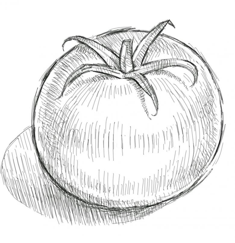 L'image d'une tomate commence par l'esquisse d'une balle sur une feuille de papier. Ses contours ne doivent pas nécessairement être clairs. Pour faire apparaître une tomate plutôt qu'un simple cercle rouge sur l'image, des feuilles en forme d'étoile sont ajoutées à la boule et une trace de fusée est faite sur son canon.