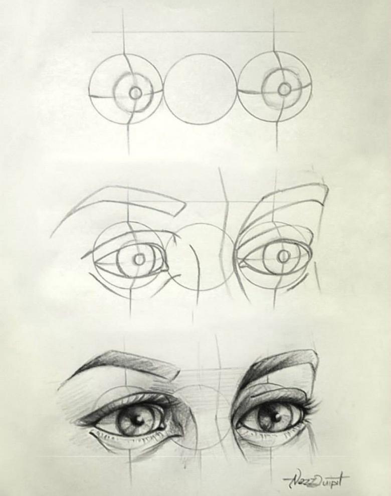 Tout d'abord, trois cercles sont dessinés sur une feuille de papier, la pupille, l'iris et la séparation du sourcil et de la paupière. Le cercle le plus extérieur doit être trois fois plus grand que celui du milieu. La création du dessin commence alors :