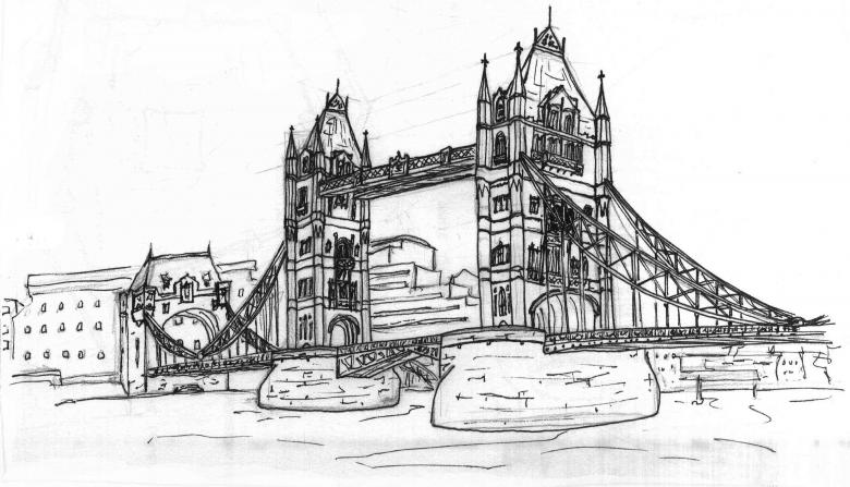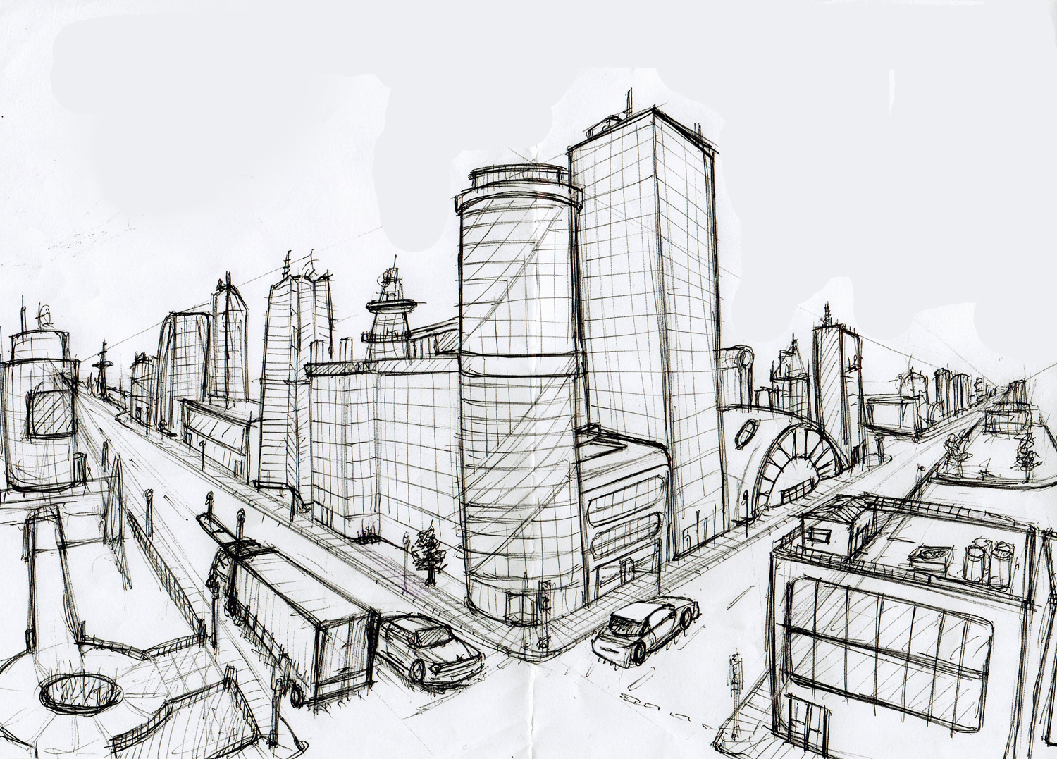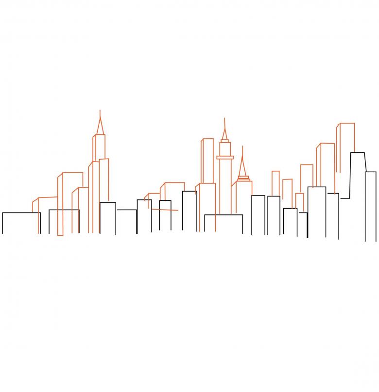 Esquissez des bâtiments tridimensionnels dans la section centrale : une église, un théâtre, une cathédrale, etc. Il ne sera pas possible de les dessiner tous, car certains bâtiments peuvent être cachés derrière les bâtiments de devant. Utilisez une photo de la ville pour obtenir une impression réaliste.