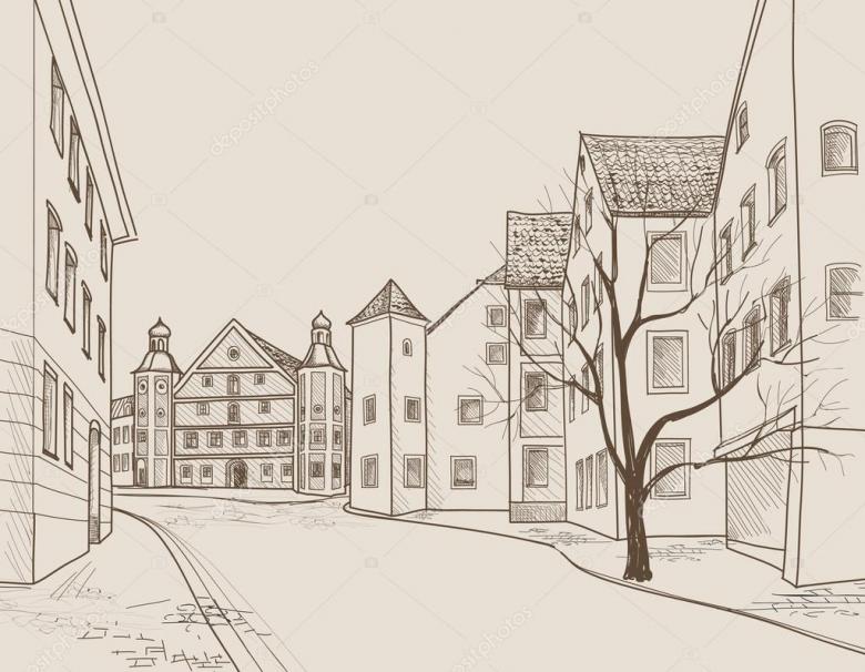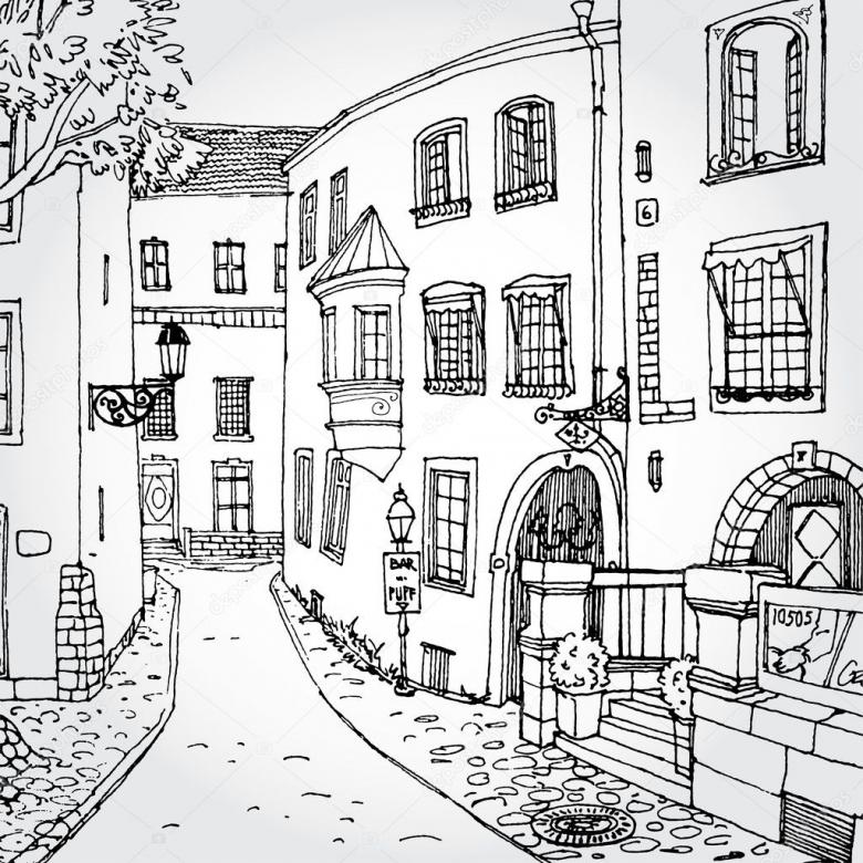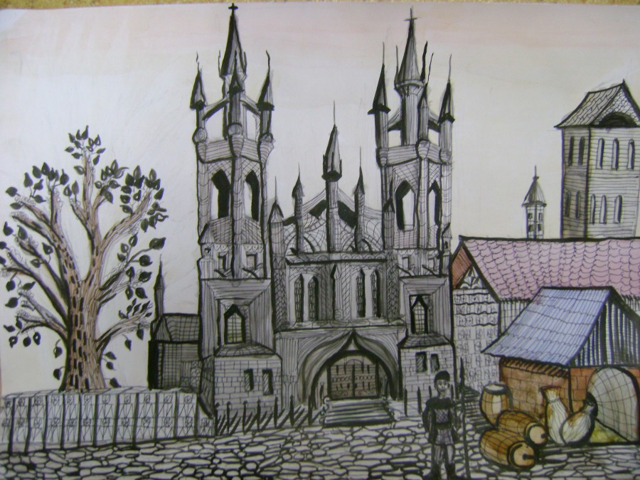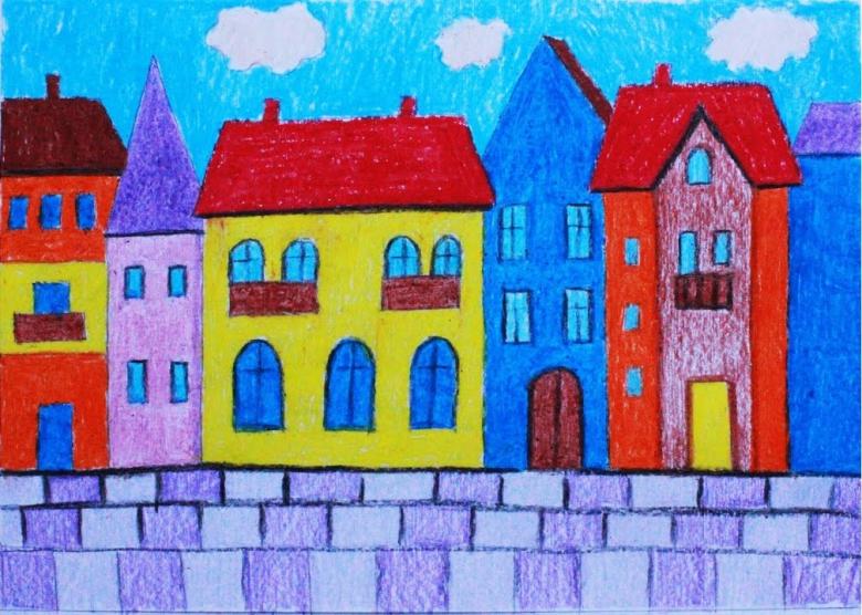 - Derrière la clôture, dessinez des maisons à étages de différentes hauteurs avec des fenêtres. Les encadrements de fenêtres peuvent être réalisés en voûte, en carré et en rectangulaire.