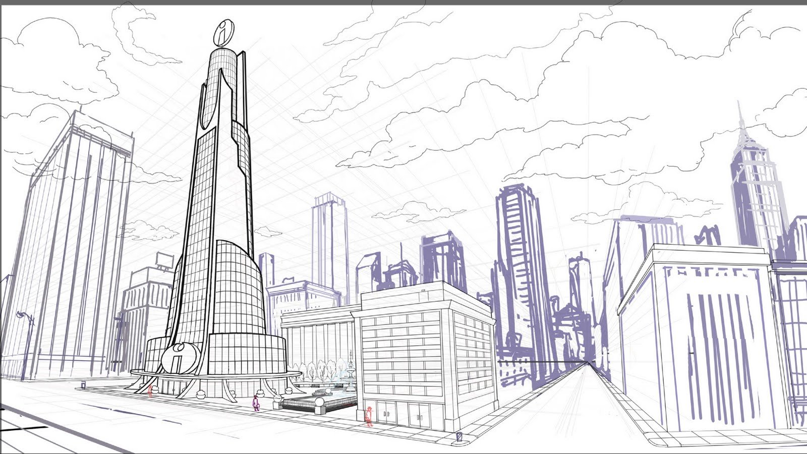 Les bâtiments de l'arrière-plan doivent être plus petits que ceux de l'avant-plan. Les bâtiments les plus hauts seront les plus beaux ici. Dessinez des trottoirs et des voies piétonnes entre les bâtiments.