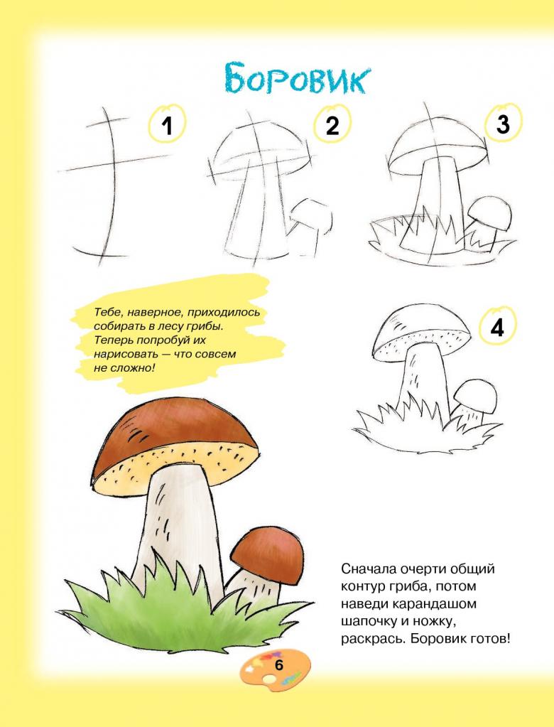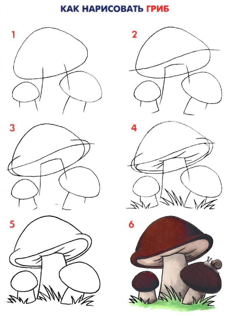 Il existe un certain schéma, étape par étape, qui est utilisé pour dessiner tous les types de champignons :