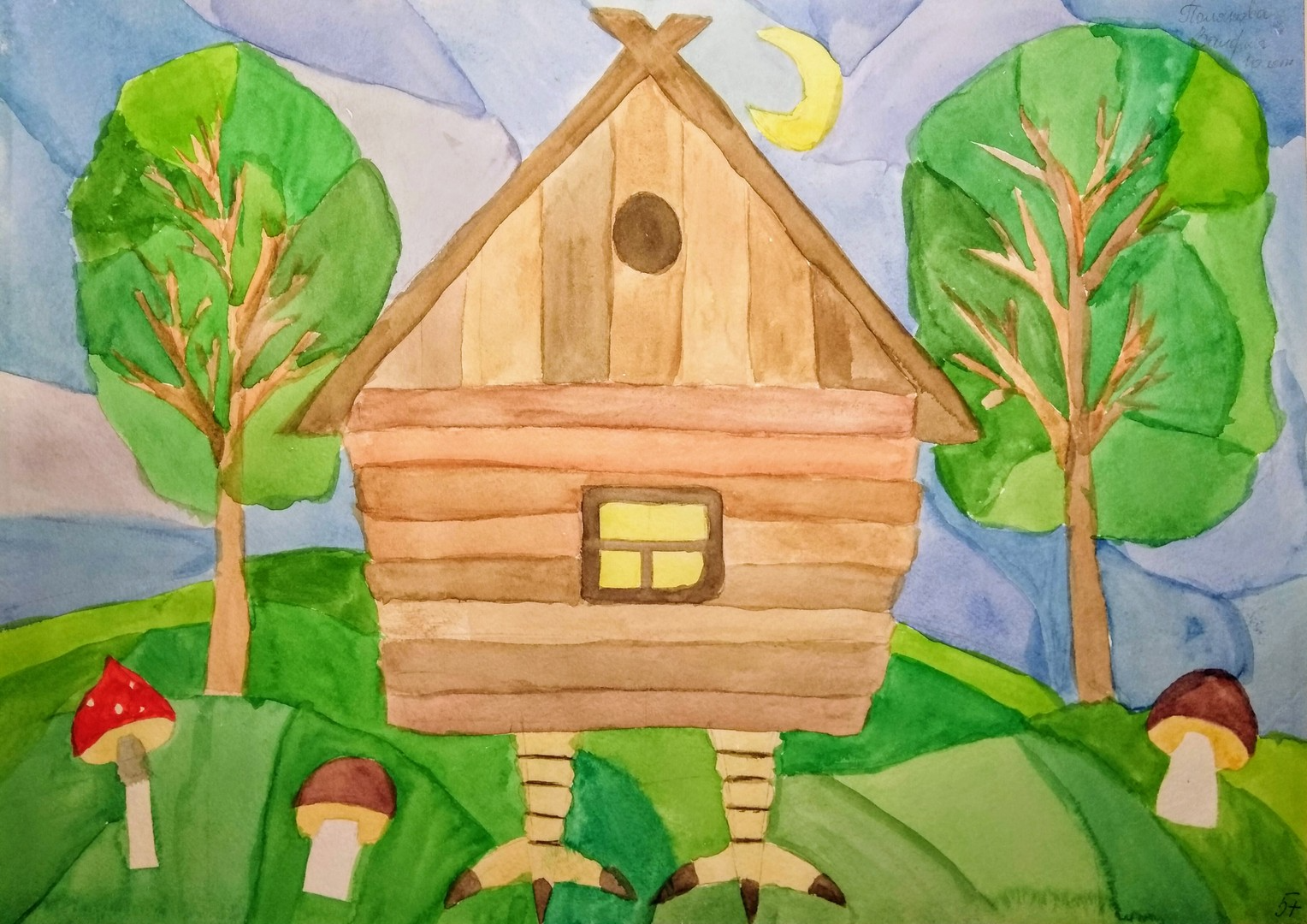 L'étape suivante consiste à dessiner une porte, une fenêtre avec des volets. L'étape suivante consiste à tracer des lignes sur les murs, c'est-à-dire des planches. Des cercles sont dessinés sur les bords de la cabane comme si tout était fait de rondins. Sur le toit, une cheminée avec de la fumée est dessinée. En bas, des pattes de poulet avec peau et écailles sont dessinées. Une habitation de conte de fées est créée.