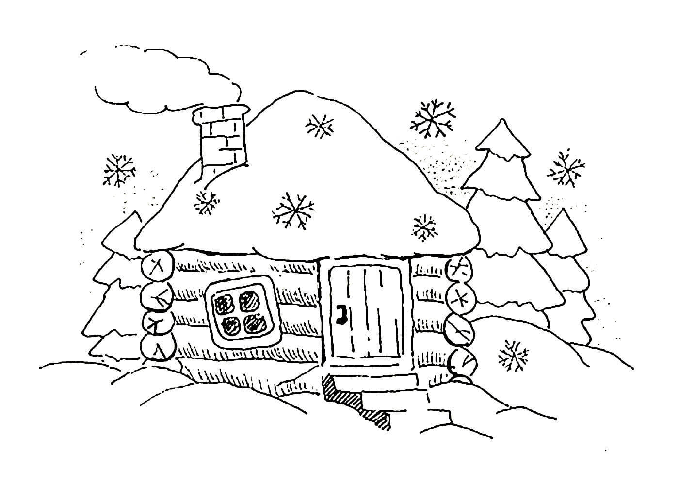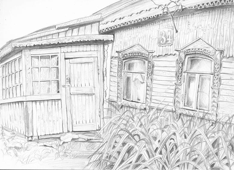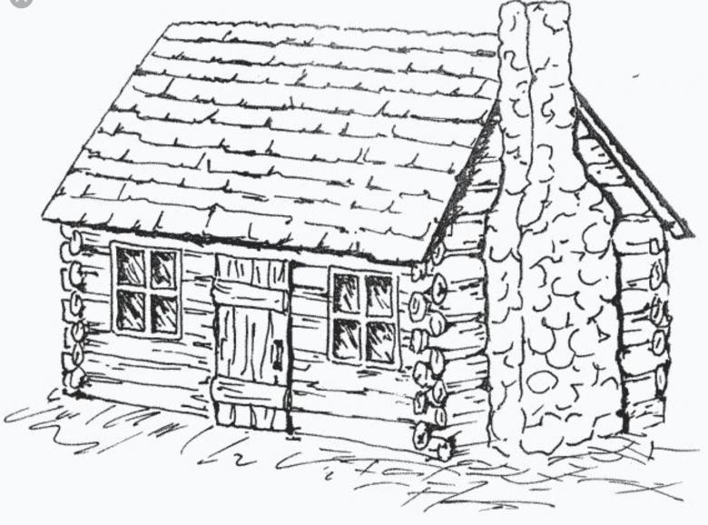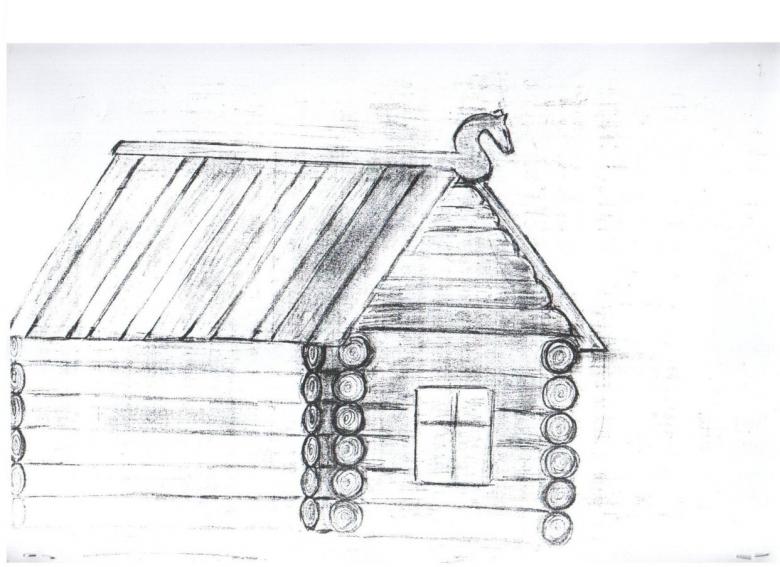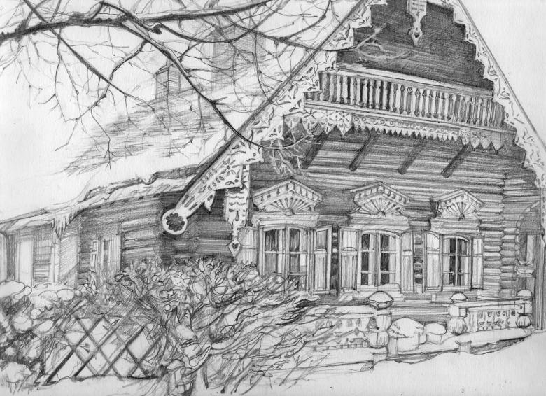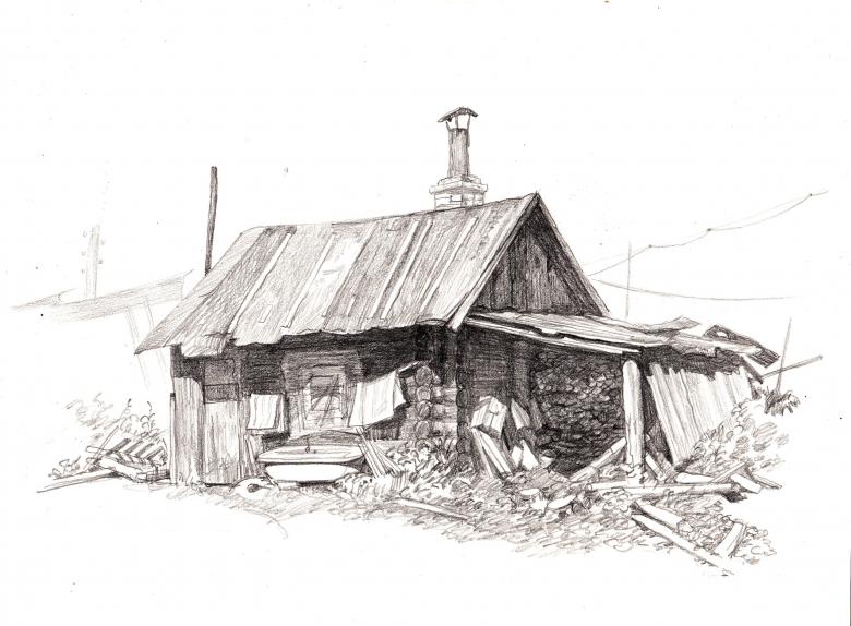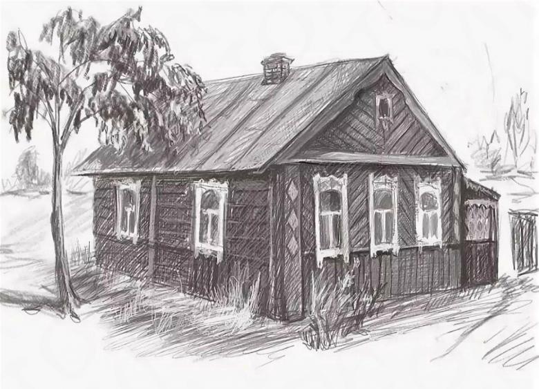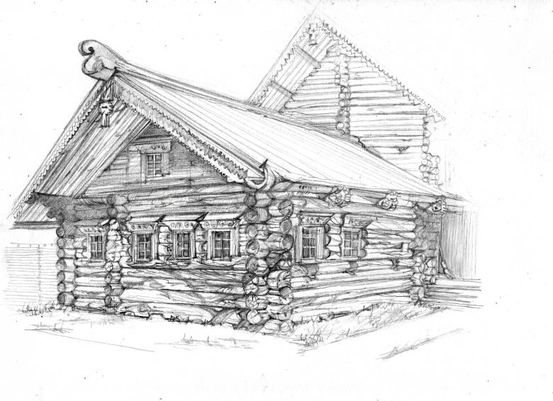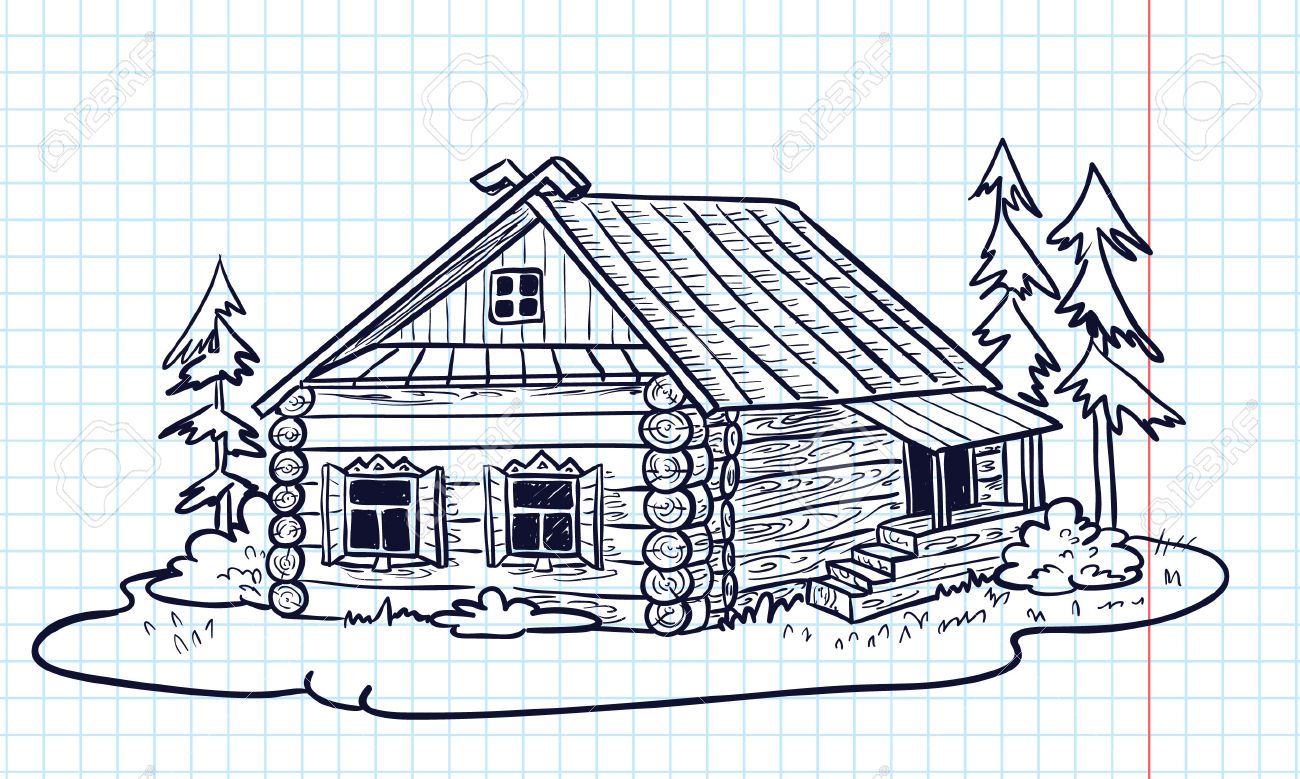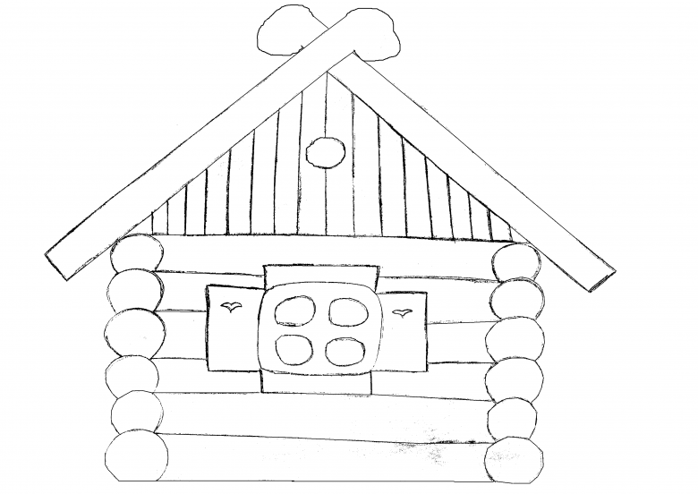L'esquisse de la cabane elle-même est simple et est dessinée avec des lignes non compliquées. Certains détails doivent être rendus réalistes. Même les enfants peuvent être intéressés par une telle activité, car le processus est simple.