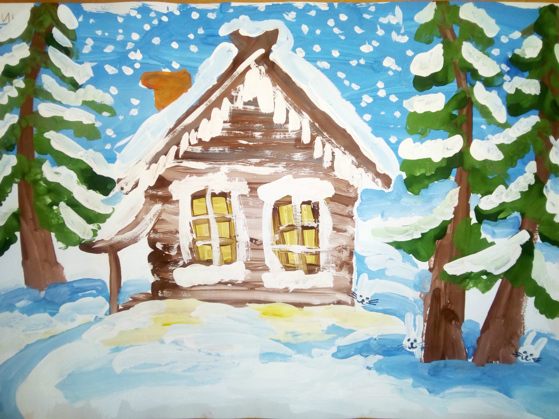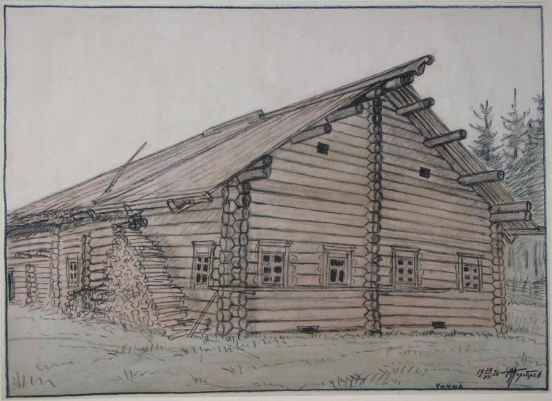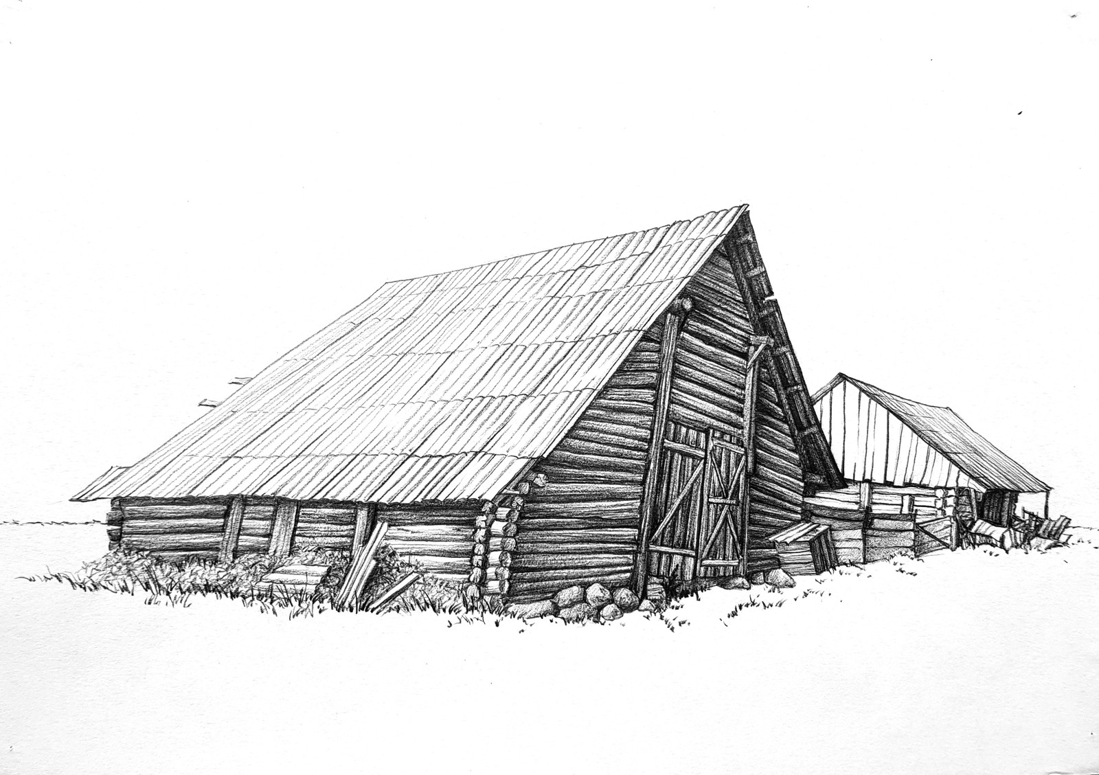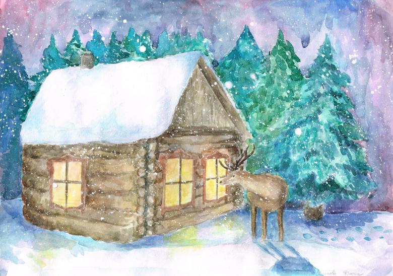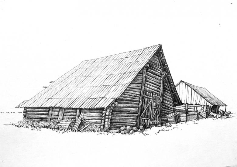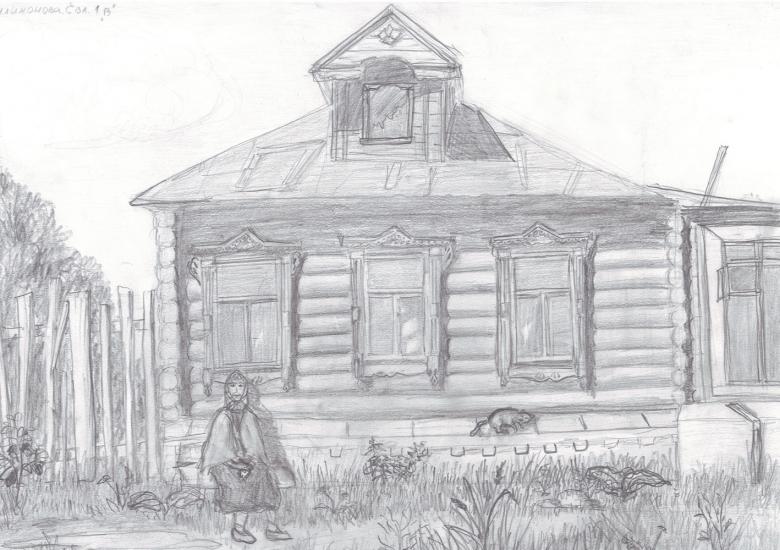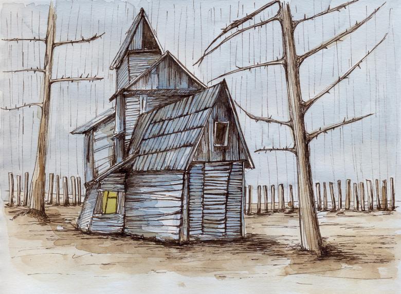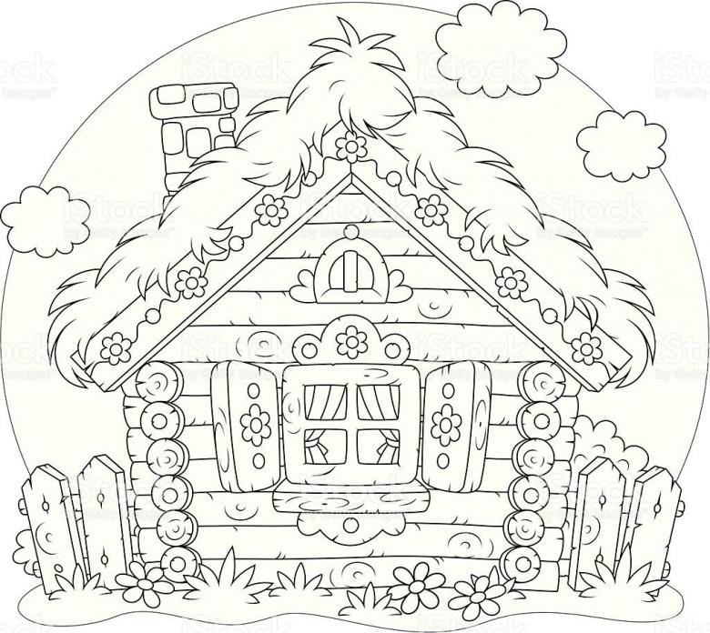 L'esquisse de la cabane elle-même est simple et est dessinée avec des lignes non compliquées. Certains détails doivent être rendus réalistes. Même les enfants peuvent être intéressés par une telle activité, car le processus est simple.