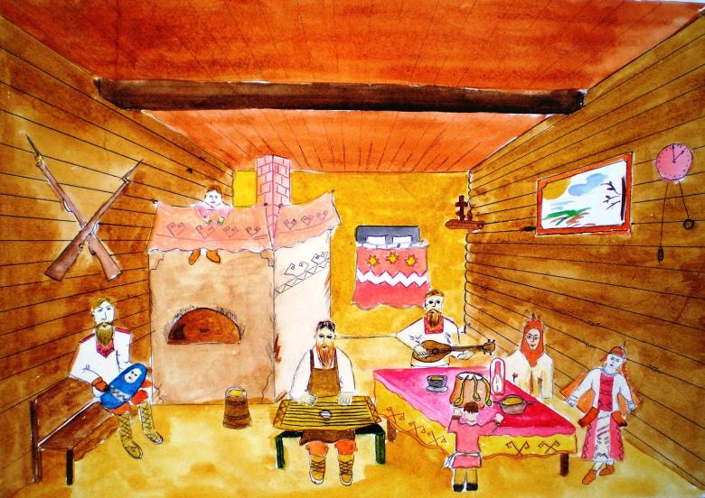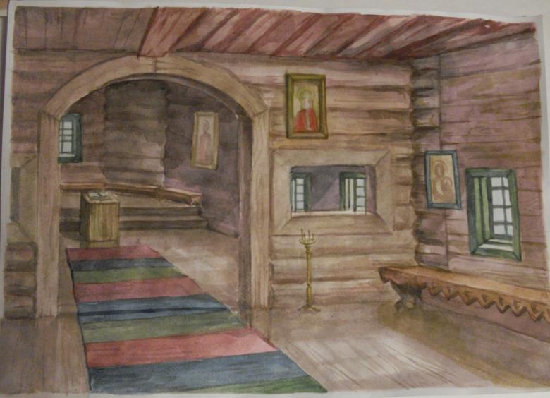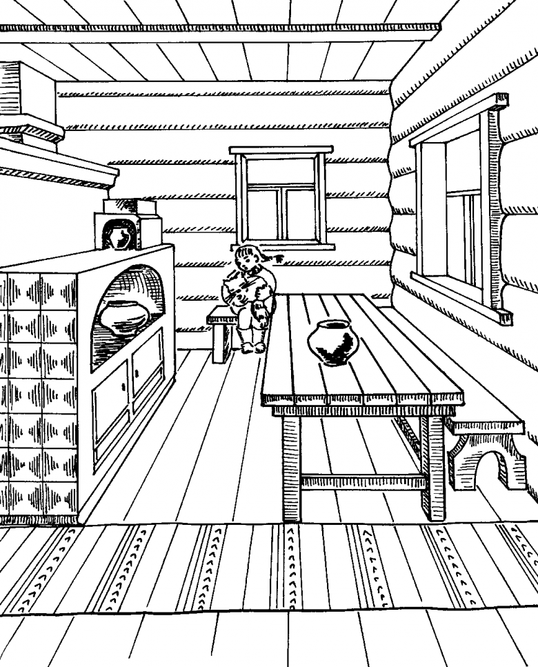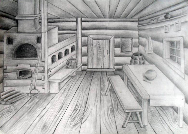 Après la vue extérieure, on peut se demander comment dessiner la cabane à l'intérieur, ce qu'elle contient, ce qui réussira à transmettre la vie des gens.