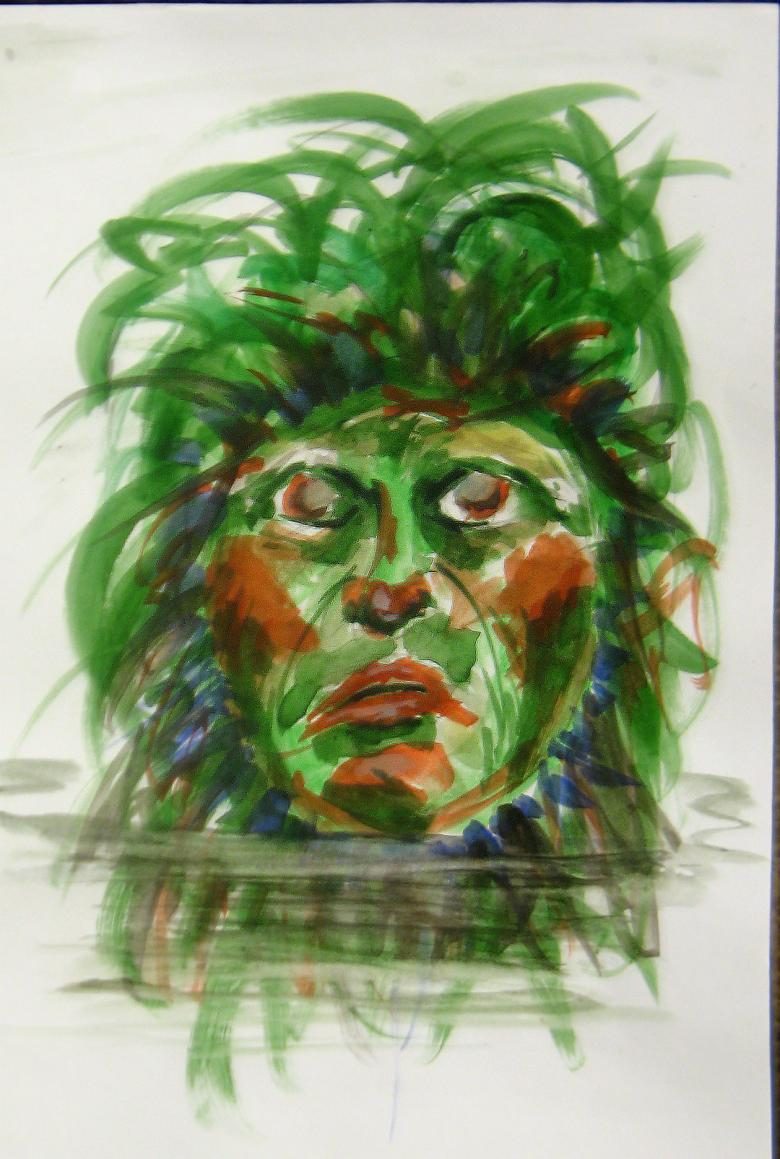 Maintenant, la créature maléfique est peinte. Ils sont généralement représentés avec une peau verte, car ils vivent dans les marécages et les marais. Leurs cheveux sont de couleur noire, mais ils n'oublient pas les mèches grises. De la mousse, des feuilles et des fleurs des marais sont ajoutées à leurs cheveux.