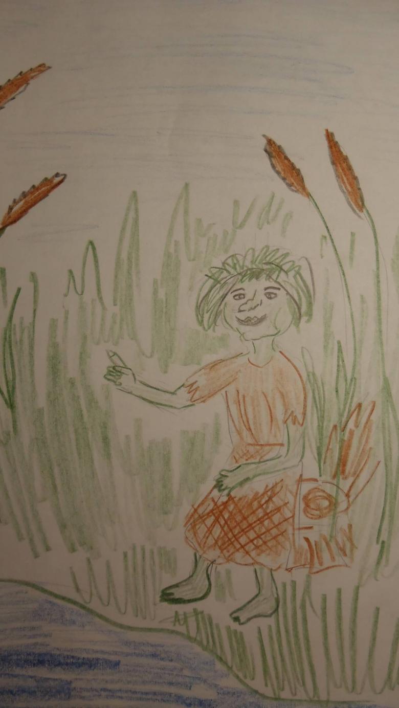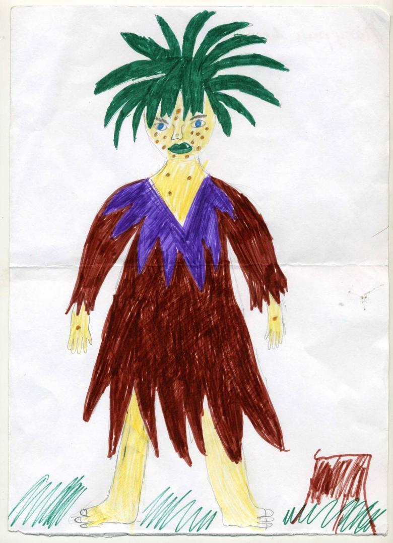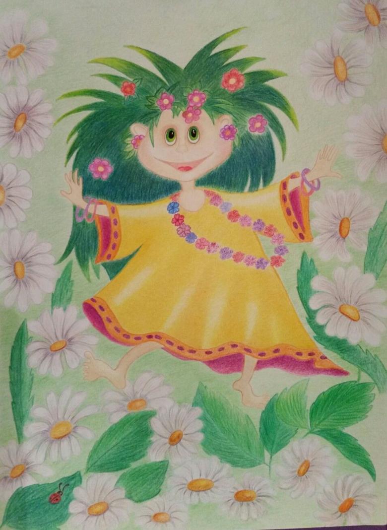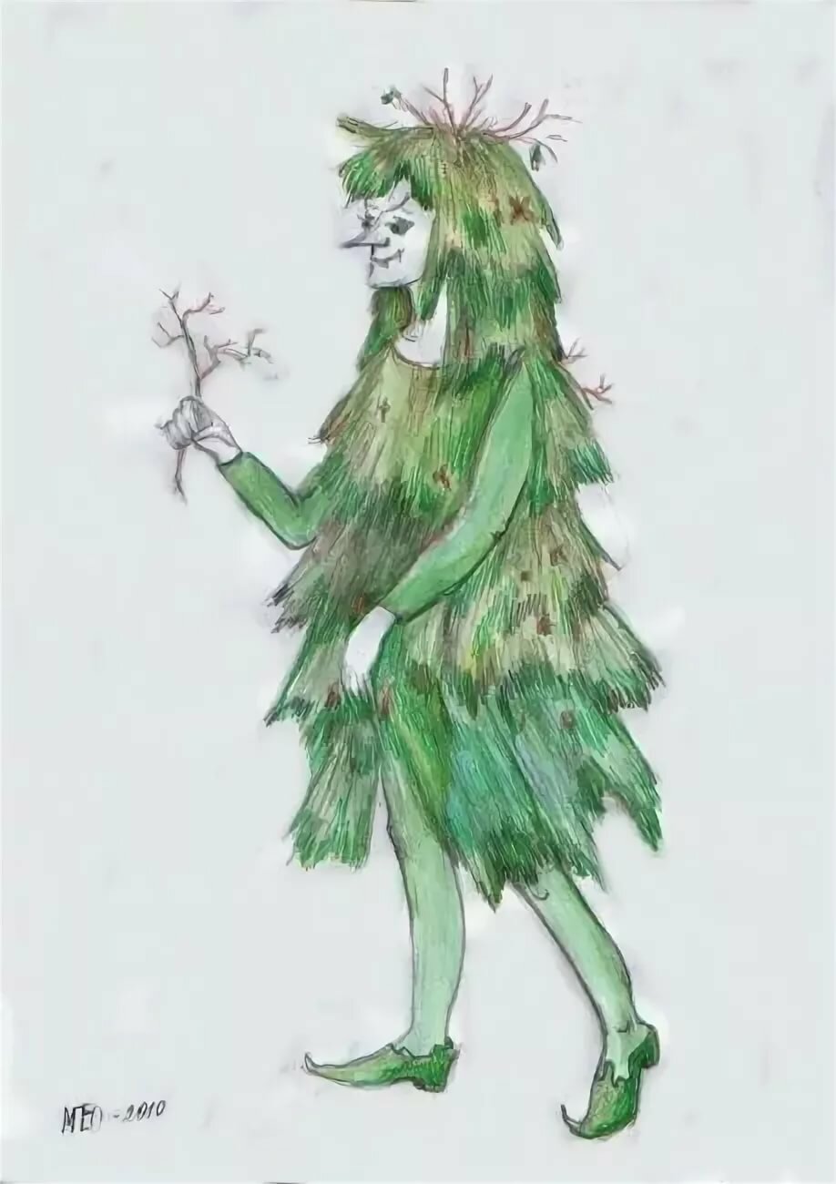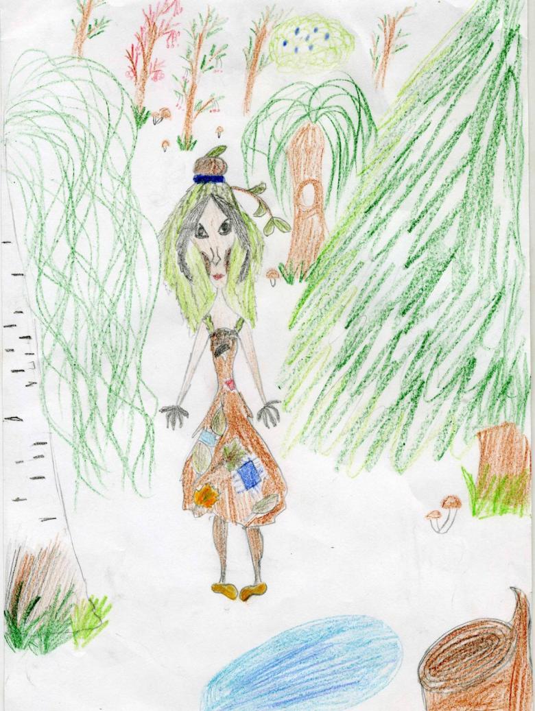 Peint sur une grande feuille de papier, en essayant de faire une image complète, décrivant non seulement l'esprit de la forêt, mais aussi le travail sur le fond derrière le personnage. Le kikimora peut être placé sur le papier dans un fourré de forêt ou dessiné sur le fond d'un marécage.