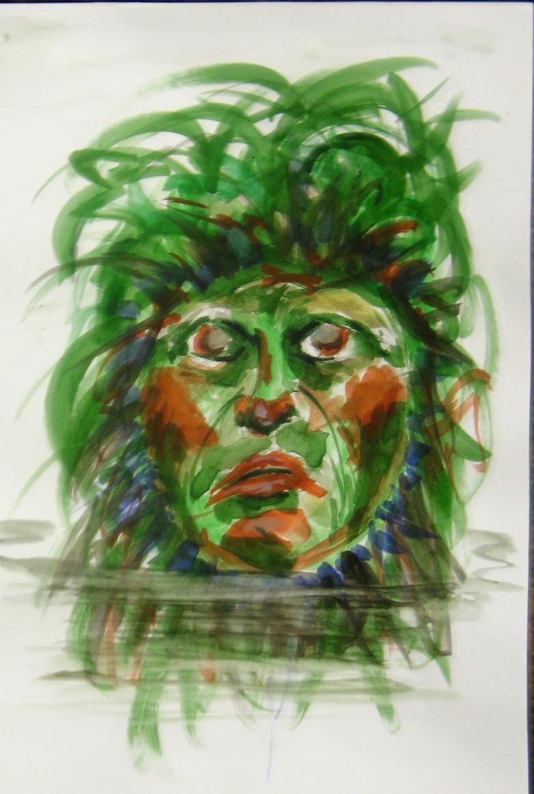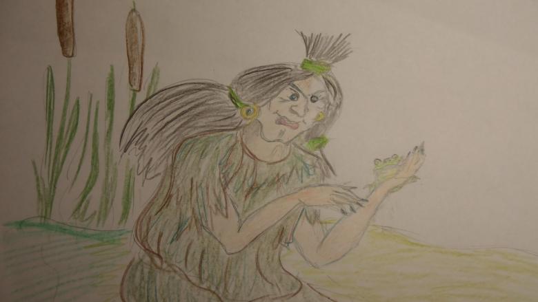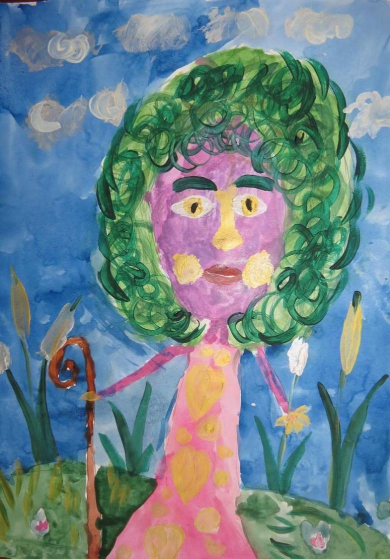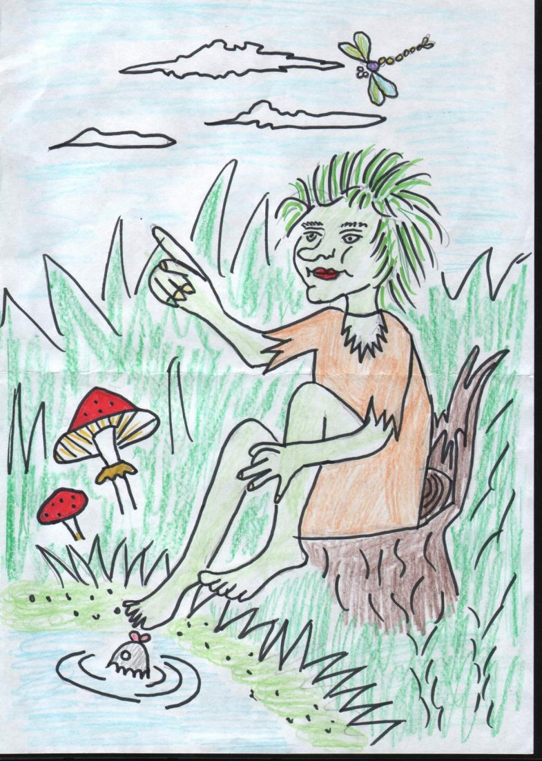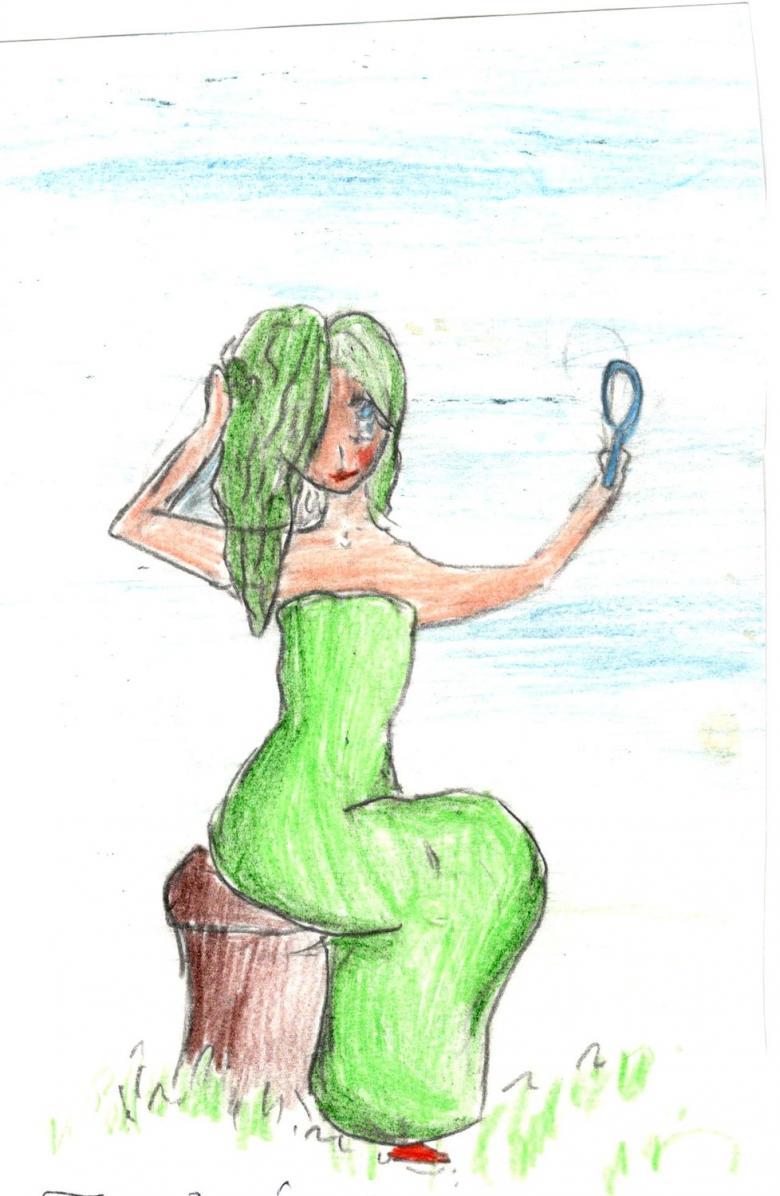 Peint sur une grande feuille de papier, en essayant de faire une image complète, décrivant non seulement l'esprit de la forêt, mais aussi le travail sur le fond derrière le personnage. Le kikimora peut être placé sur le papier dans un fourré de forêt ou dessiné sur le fond d'un marécage.