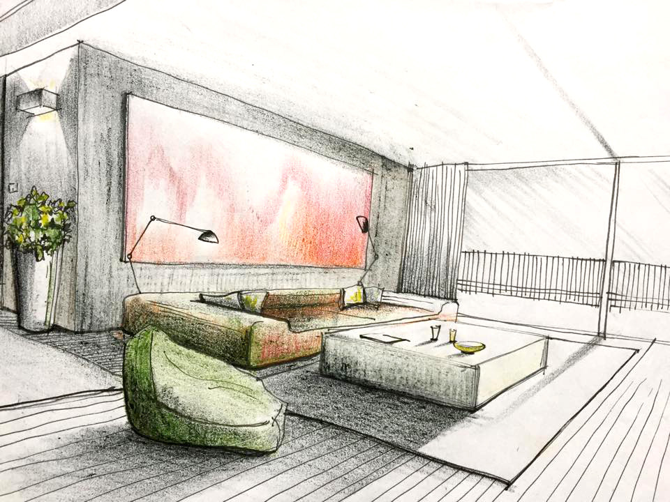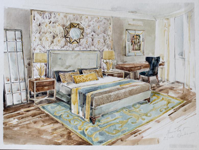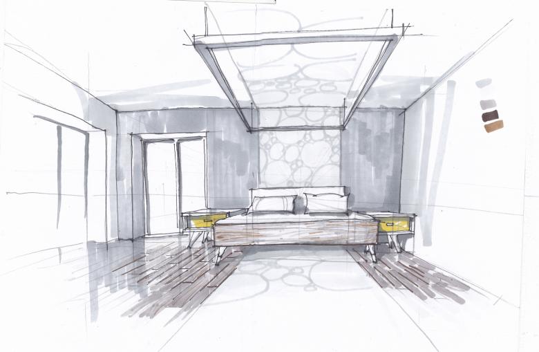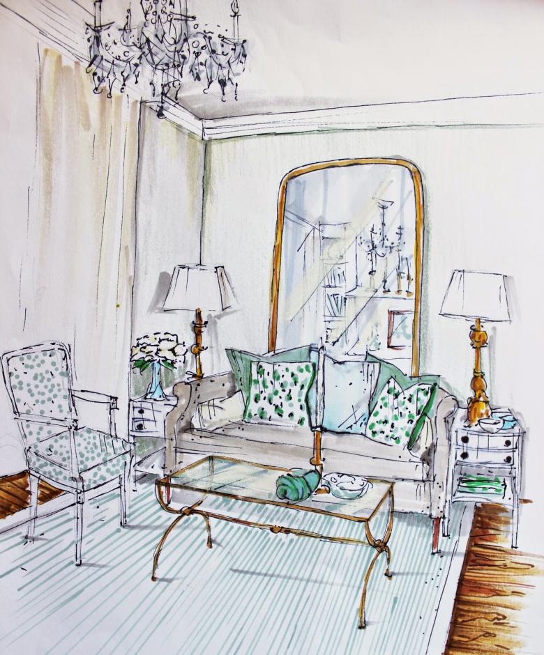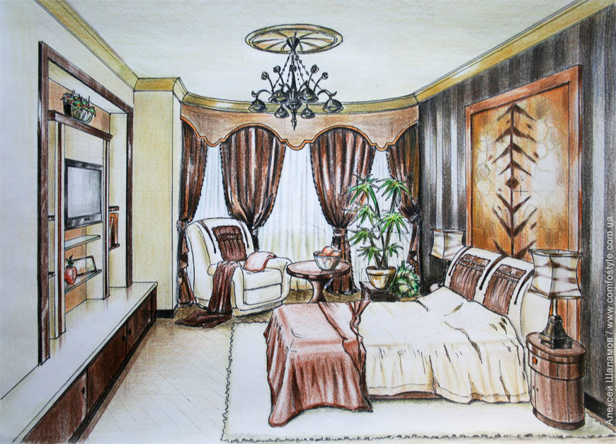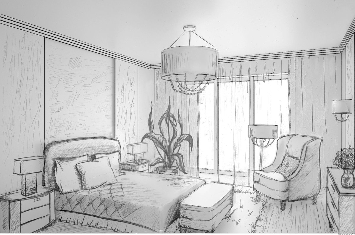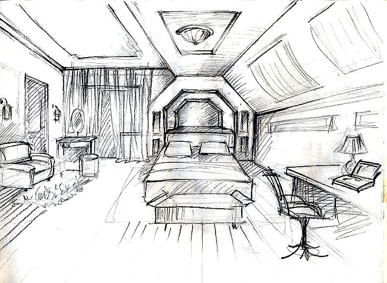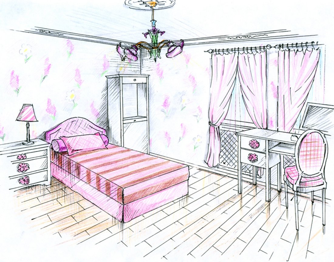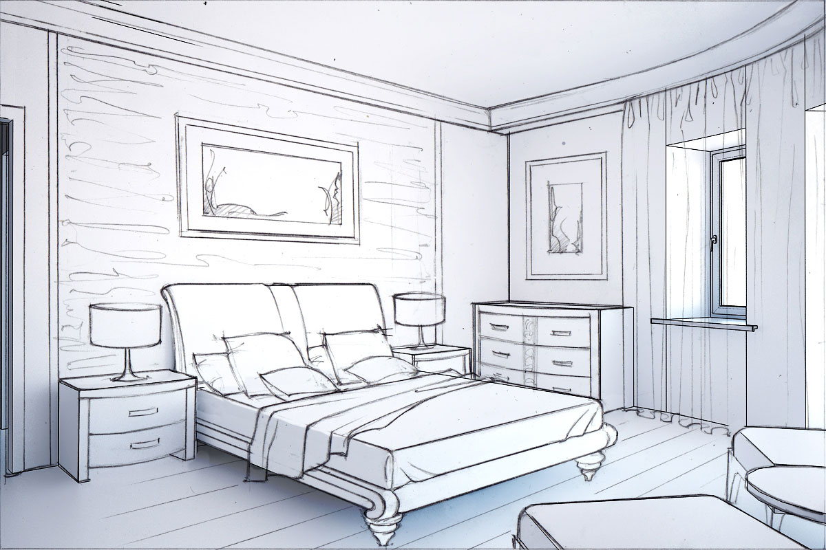 De cette façon, les formes de base de la pièce sont dessinées : canapé, lit, table, armoire, table de chevet, fauteuil et ainsi de suite. Après avoir dessiné les meubles, il convient d'esquisser le décor - rideaux, nappe, lampadaires sur la table de chevet ou le bureau, fleurs, posters sur le mur ou tableaux -.