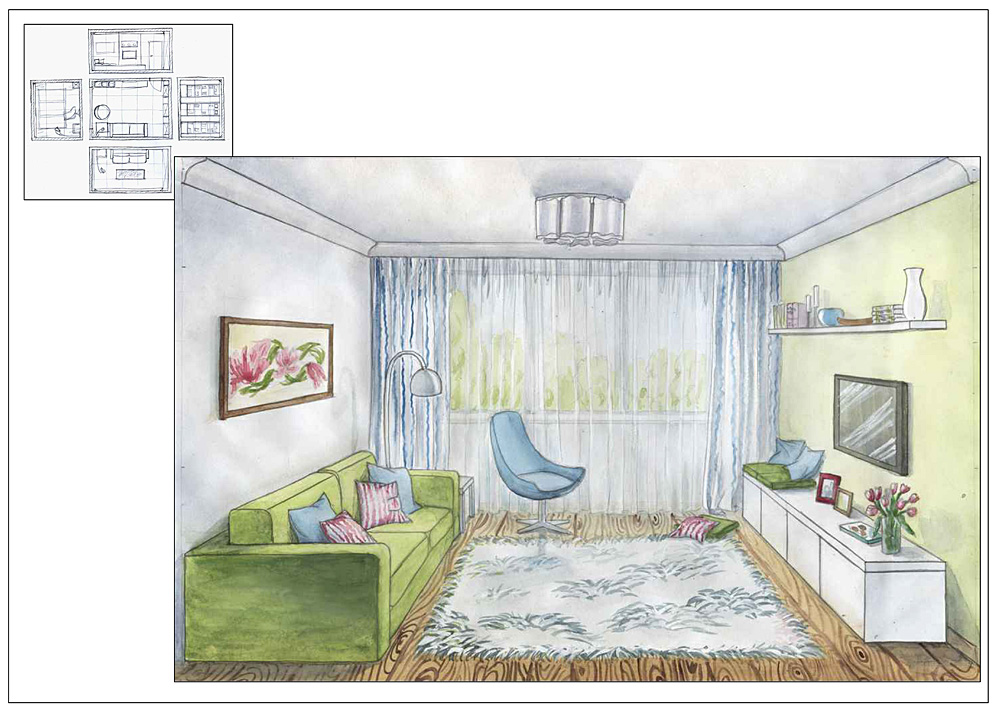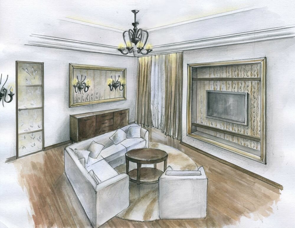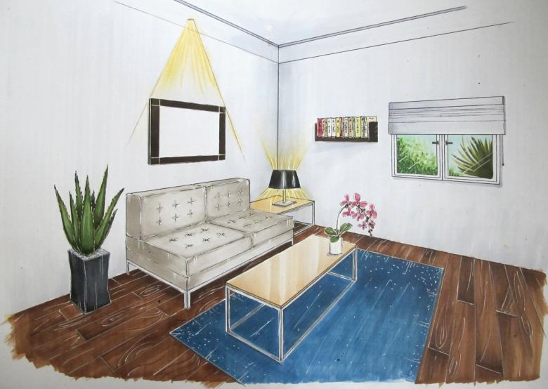 Vous pouvez dessiner des luminaires au plafond ou sur les murs latéraux. Ensuite, vous pouvez marquer le parquet, le linoléum, la moquette au sol ou le papier peint. Mais tout doit être marqué par des lignes fines afin que ces détails ne surchargent pas l'image et n'attirent pas l'attention plus que les principaux éléments du mobilier.