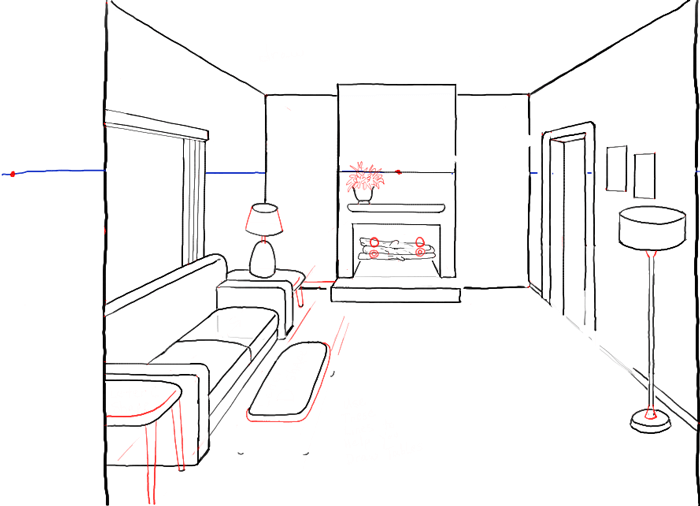 - L'étape suivante consiste à dessiner le point de fuite. Il est situé sur la ligne horizontale à l'endroit où se trouve l'angle prévu de la pièce.