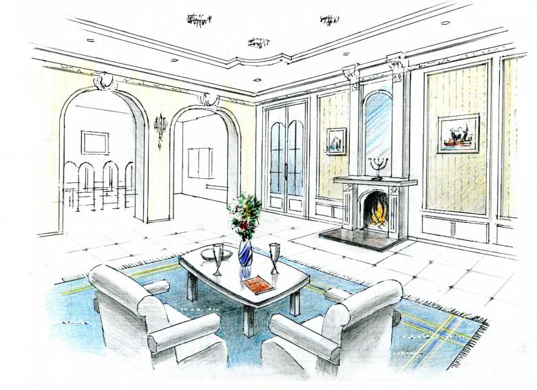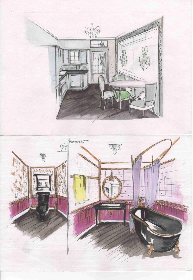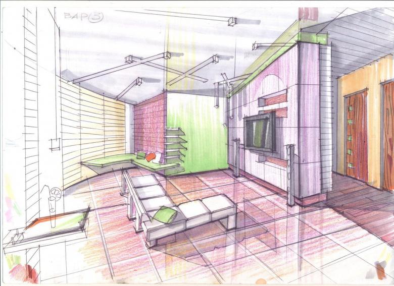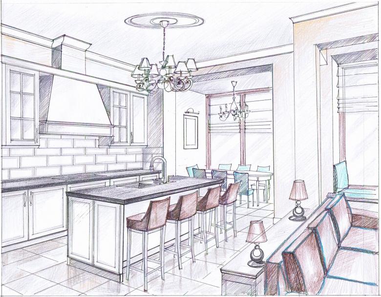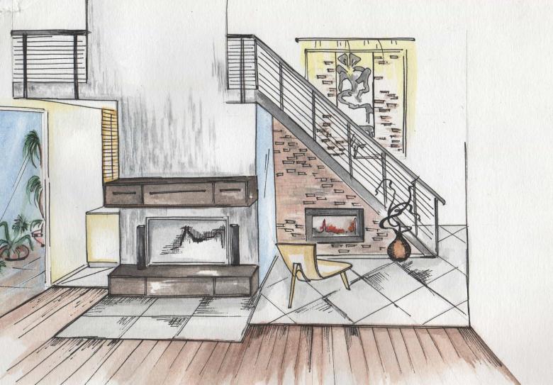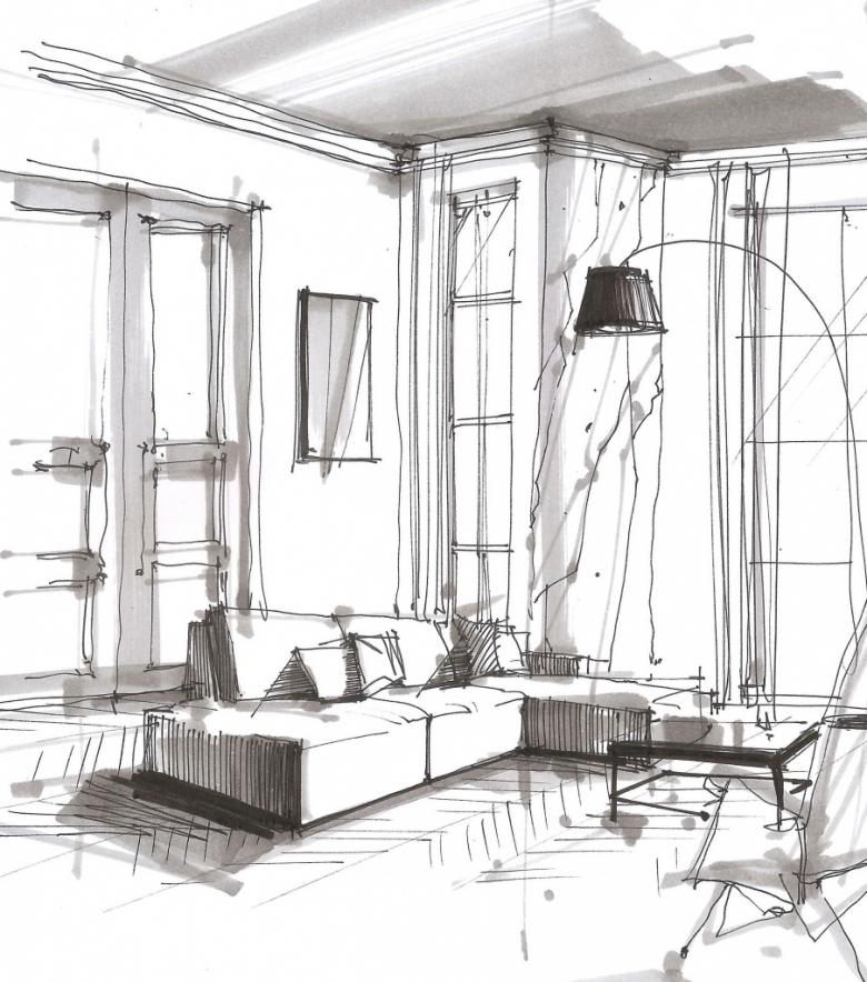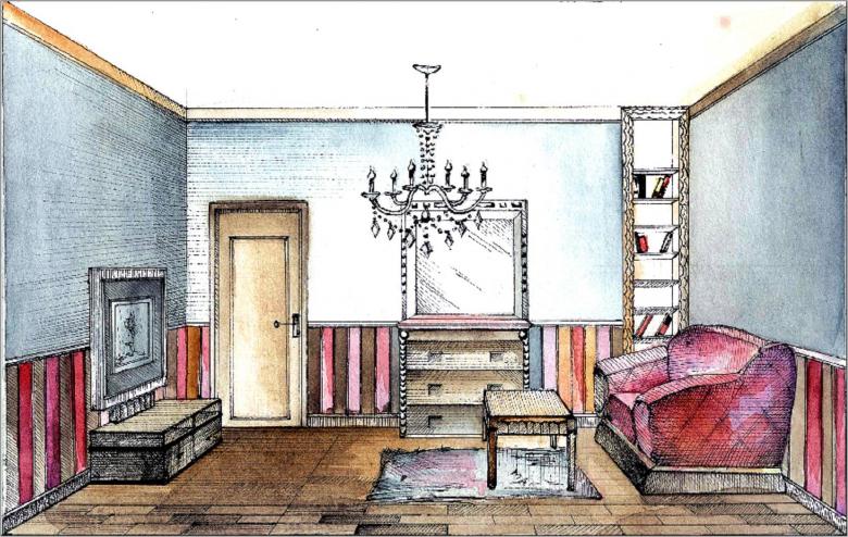 En observant l'ordre des opérations, vous pouvez dépeindre n'importe quelle pièce. Pour vous aider, vous pouvez prendre des images de pièces ou de meubles. Après avoir tracé les contours de tous les éléments de mobilier et de décoration, il faut effacer toutes les lignes auxiliaires avec une gomme et sélectionner les éléments principaux du dessin avec un crayon doux marqué B.