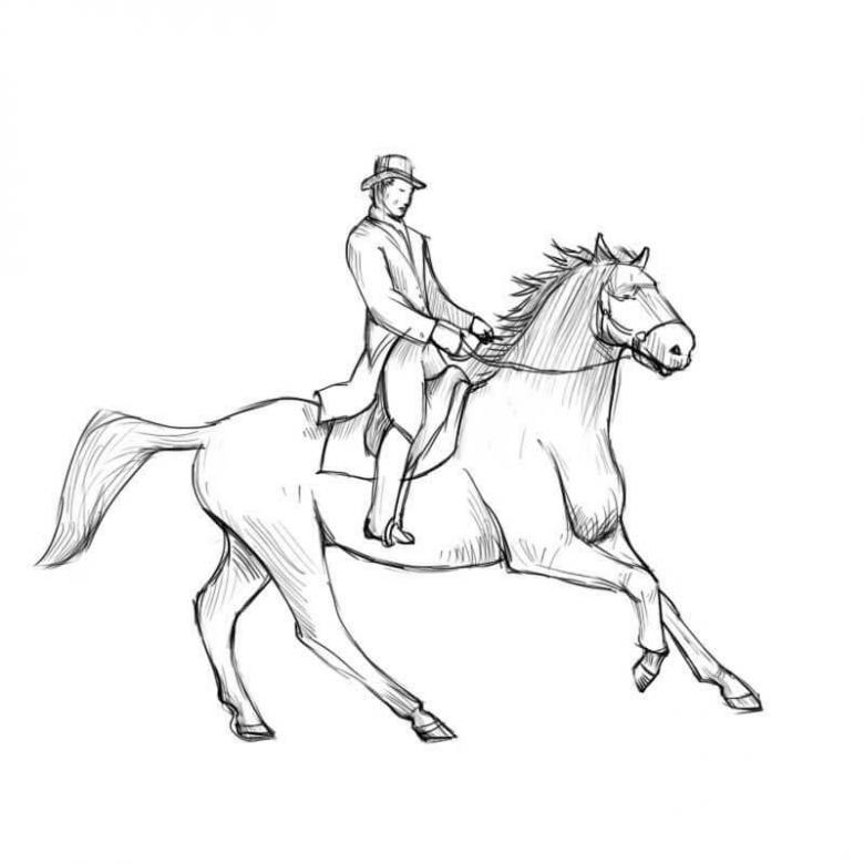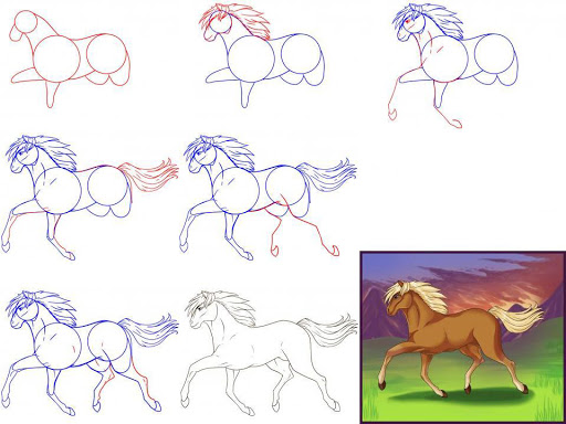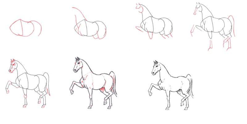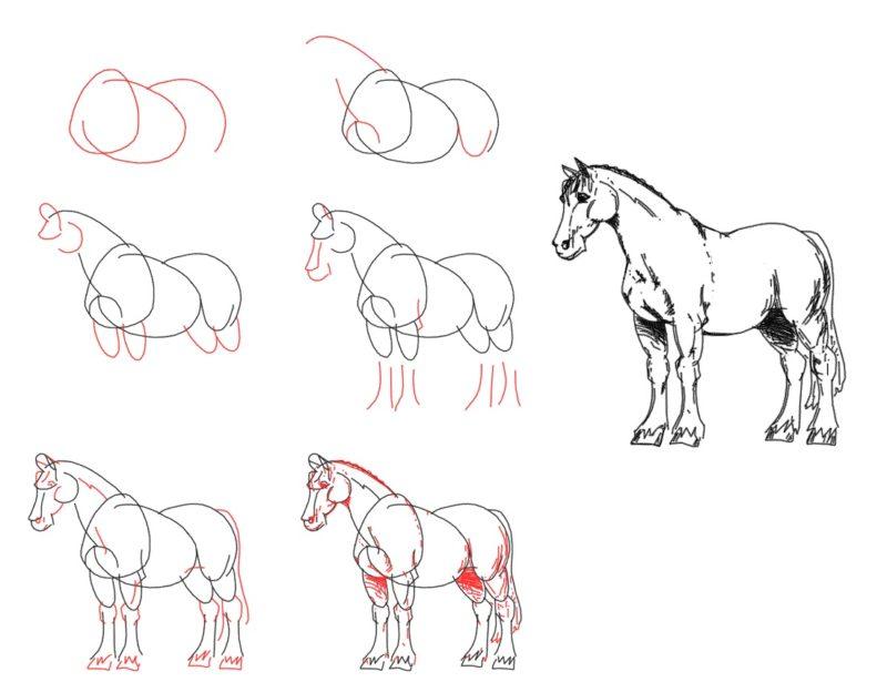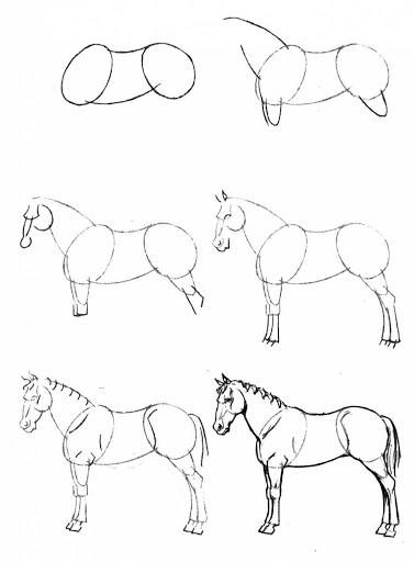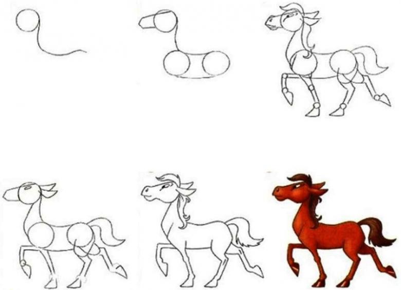 - Les jambes suivent le torse. Il est nécessaire de marquer les points des articulations qui constituent les courbes des jambes, de les relier par des lignes droites. Les articulations des genoux des jambes avant sont courbées vers l'avant et doivent être dessinées en forme de cube. Les pattes arrière se courbent vers l'arrière et doivent être dessinées comme des ovales. Les genoux d'un cheval adulte sont suffisamment hauts et il faut en tenir compte lors du dessin.