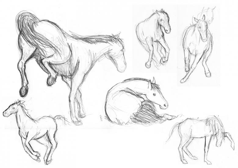 - Un petit cercle pour servir de base à la croupe. La croupe est reliée à la tête par un cou qui est dessiné avec des traits fluides. De la croupe elle-même partent les pattes avant et les sabots.