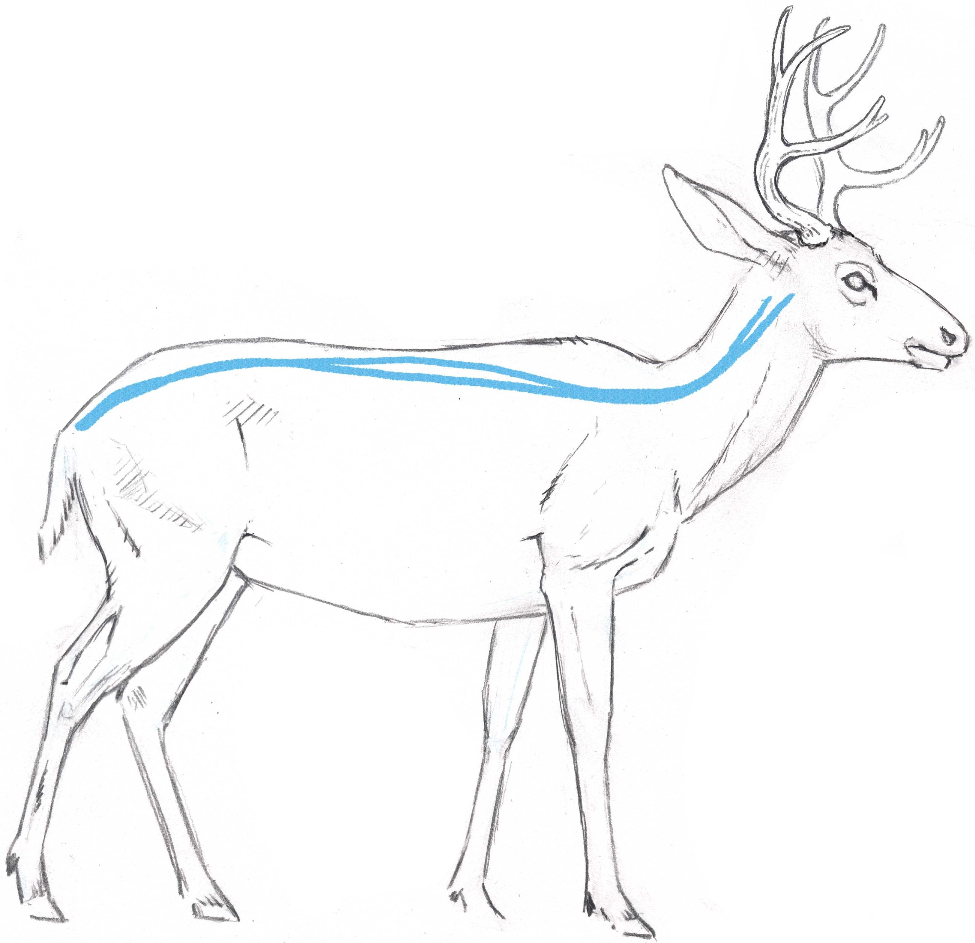 - A partir de la ligne des oreilles, on trace une ligne courbe, le futur dos du cerf, jusqu'aux pattes arrière.