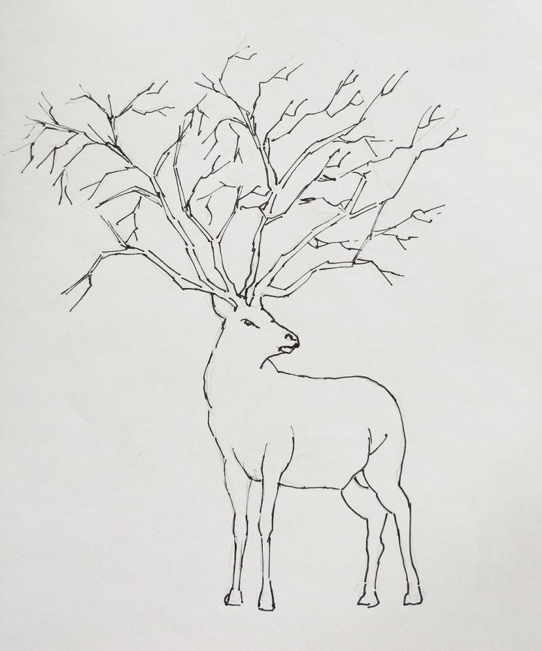 - Du sommet de la tête sont dessinées les cornes, en référence à un dessin de cerf ou à une photo de cerf.