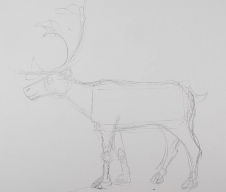- Ensuite, vous effacez les contours inutiles avec la gomme, vous mettez en évidence le visage et le nez du renne et vous tracez des yeux en amande.