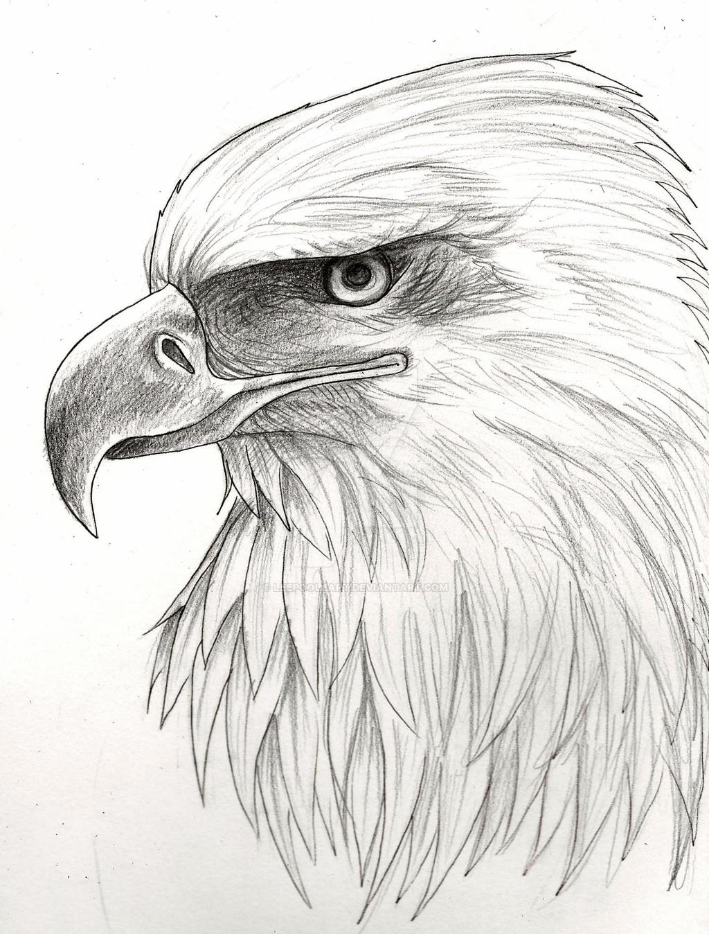 L'œil est également dessiné sur la tête. Pour donner à l'aigle un air redoutable, il faut en plus dessiner un pli caractéristique au-dessus de l'œil. Dans les dessins d'un aigle, la tête est toujours laissée blanche et le plumage est tracé verticalement à partir de la ligne située sous le cou.