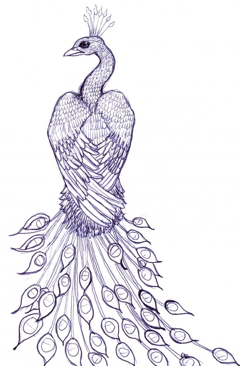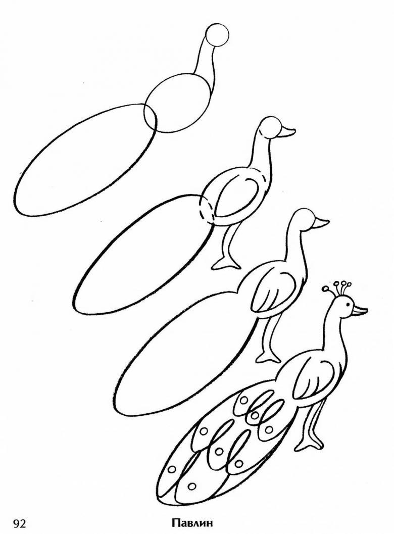Dessiner un paon n'est pas si difficile, il est beaucoup plus difficile de représenter l'oiseau sous le bon angle. Pour ce faire, l'artiste en herbe doit s'entraîner à tracer des lignes pointillées, des cercles et des ovales sur la feuille.