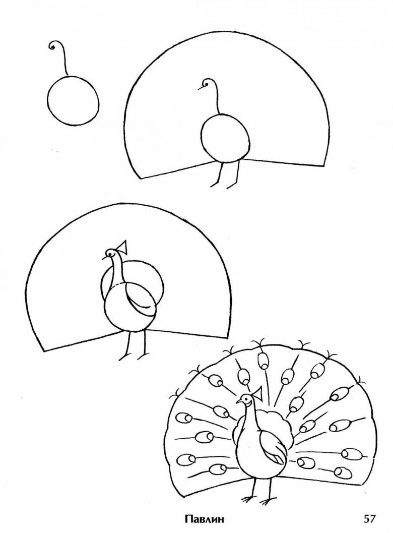 La figure du paon est la meilleure pour l'entraînement actif des doigts et vous permet de développer la plasticité de vos doigts. Un dessin classique (hors composition) se compose de plusieurs parties : le corps, la tête et la queue.