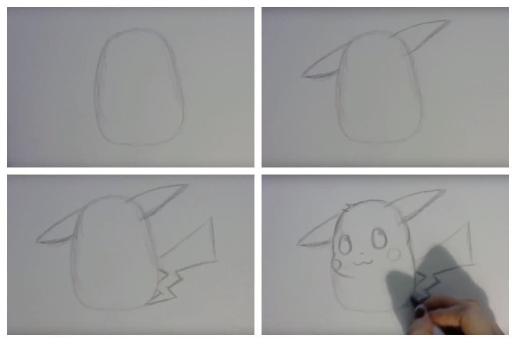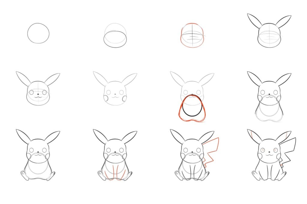 - Regardez l'image de Pikachu. Rappelez-vous les proportions des parties du corps les unes par rapport aux autres. Imaginez des formes géométriques à la place des différentes parties du corps dont la forme est adaptée.