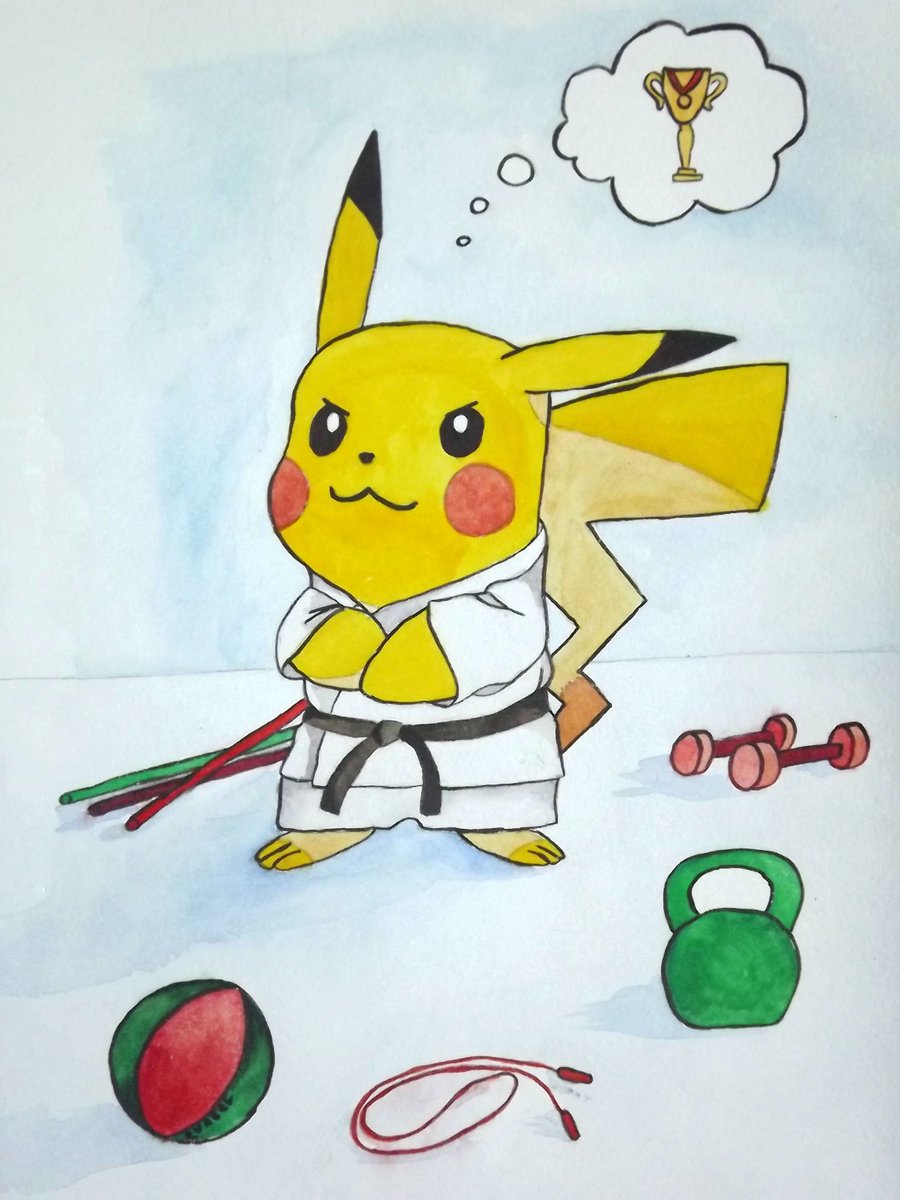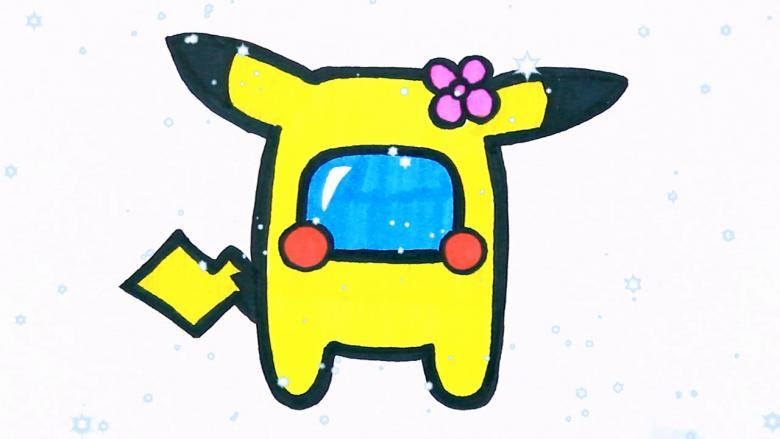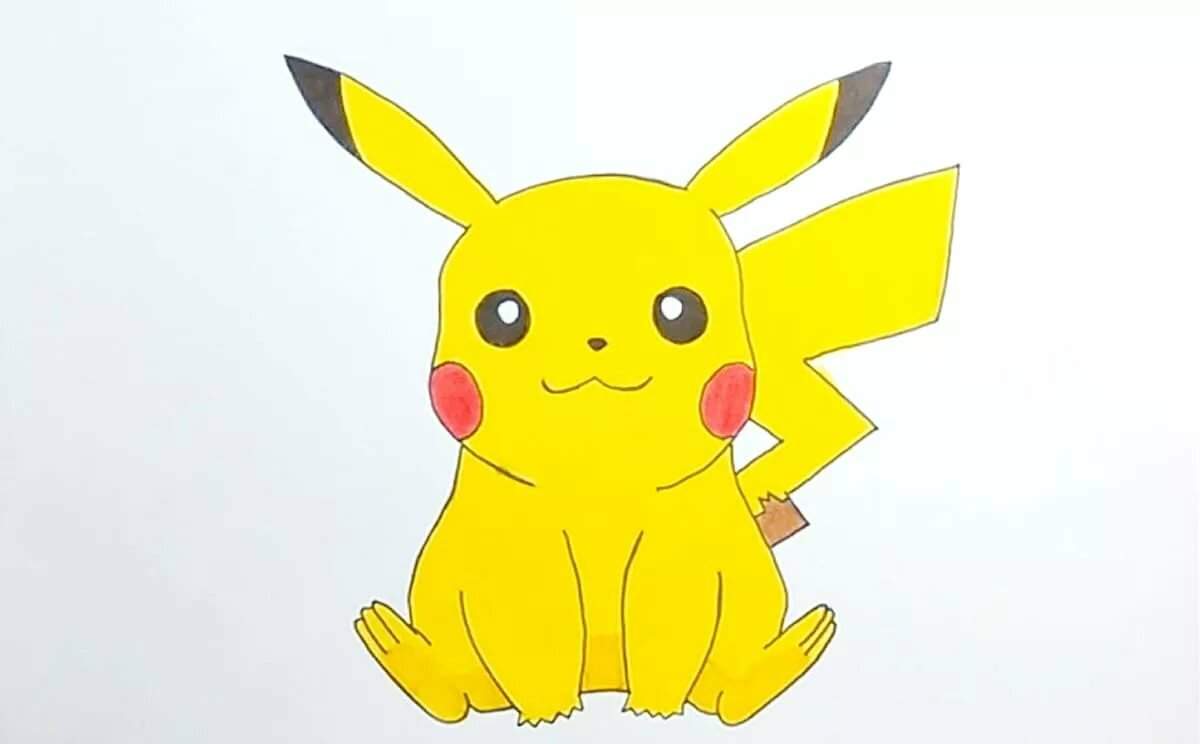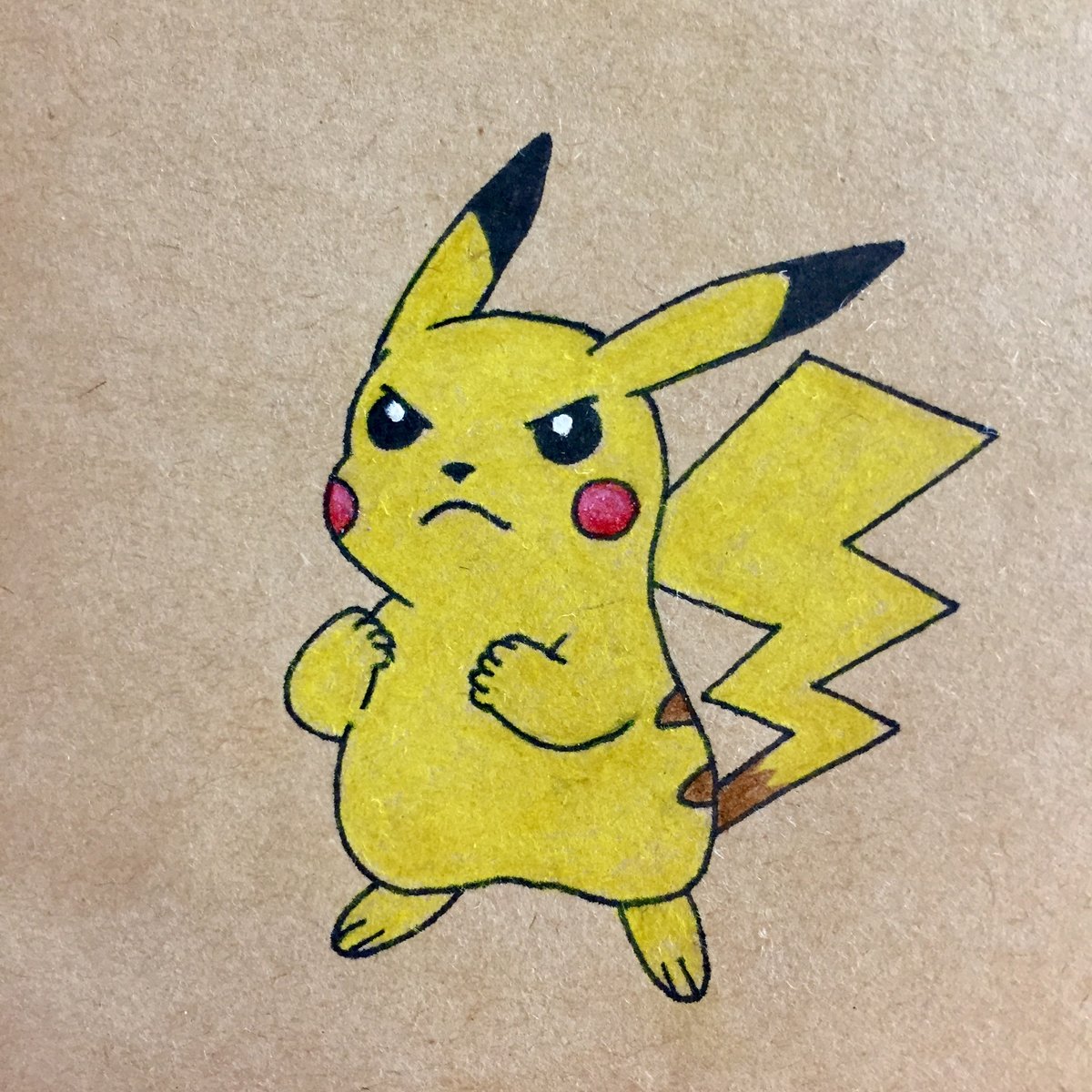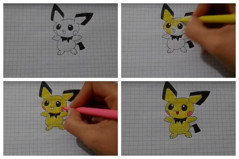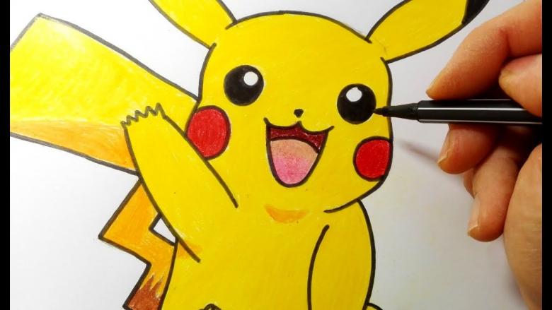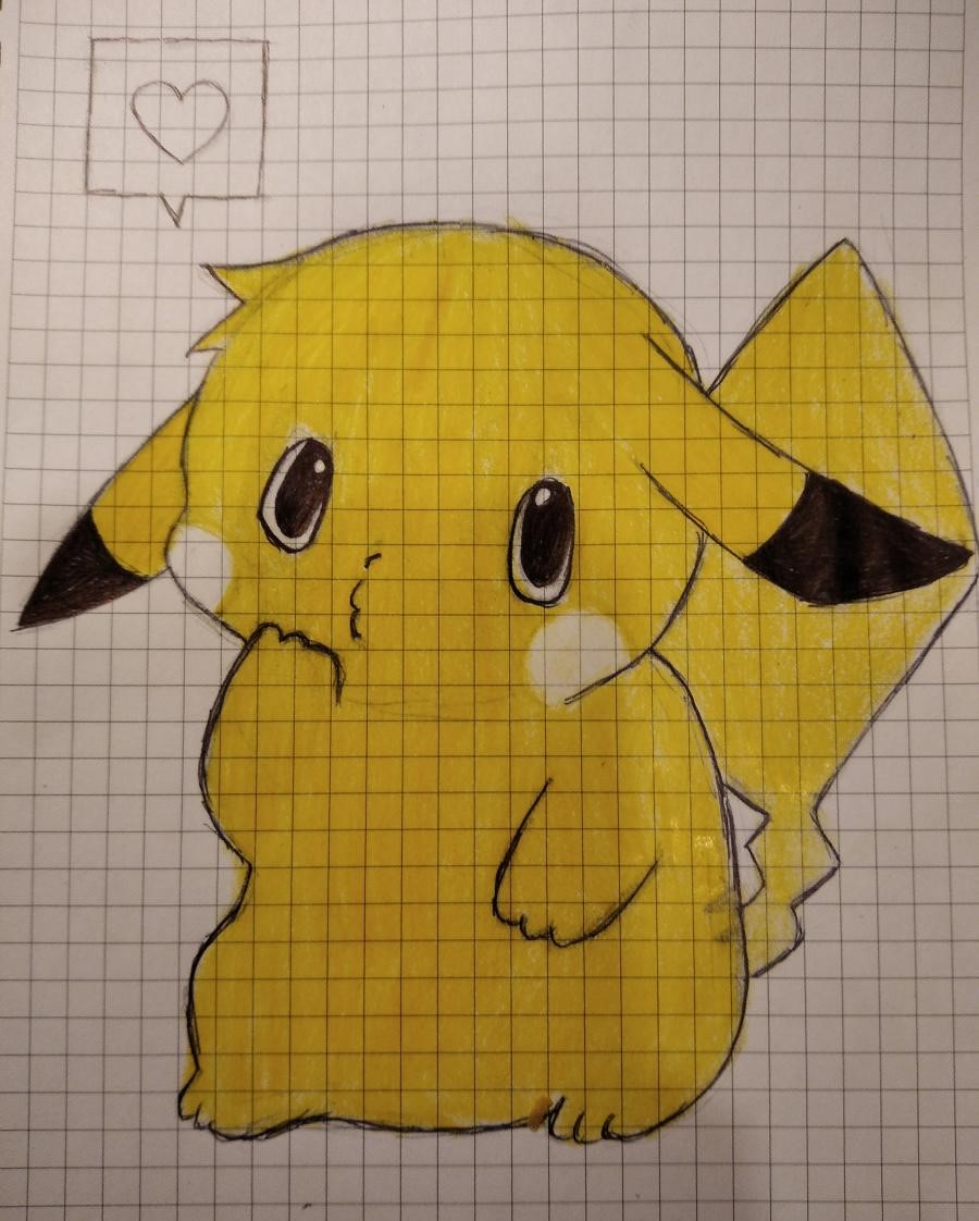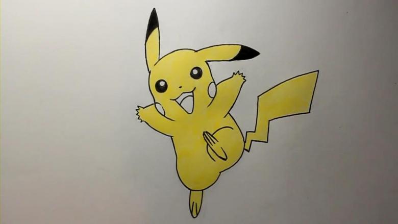- Peignez Pikachu en jaune, les joues en rose et tracez le contour du dessin en noir.