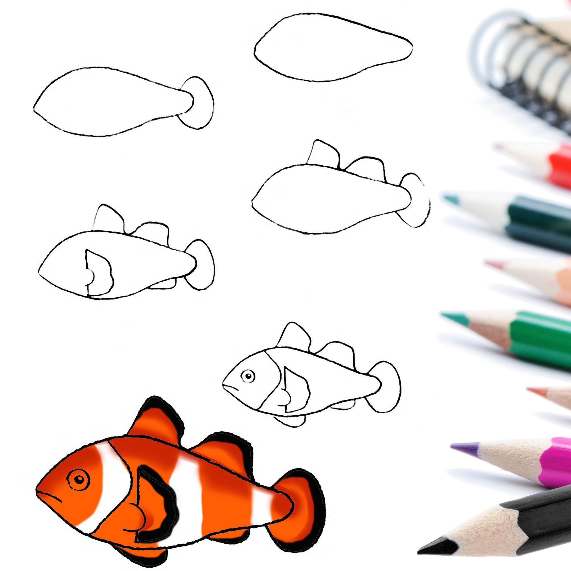 Le poisson clown est dessiné de différentes manières, ce qui vous permet de choisir votre poisson préféré. Et son dessin au crayon en couleur sera amusant pour les plus jeunes artistes.