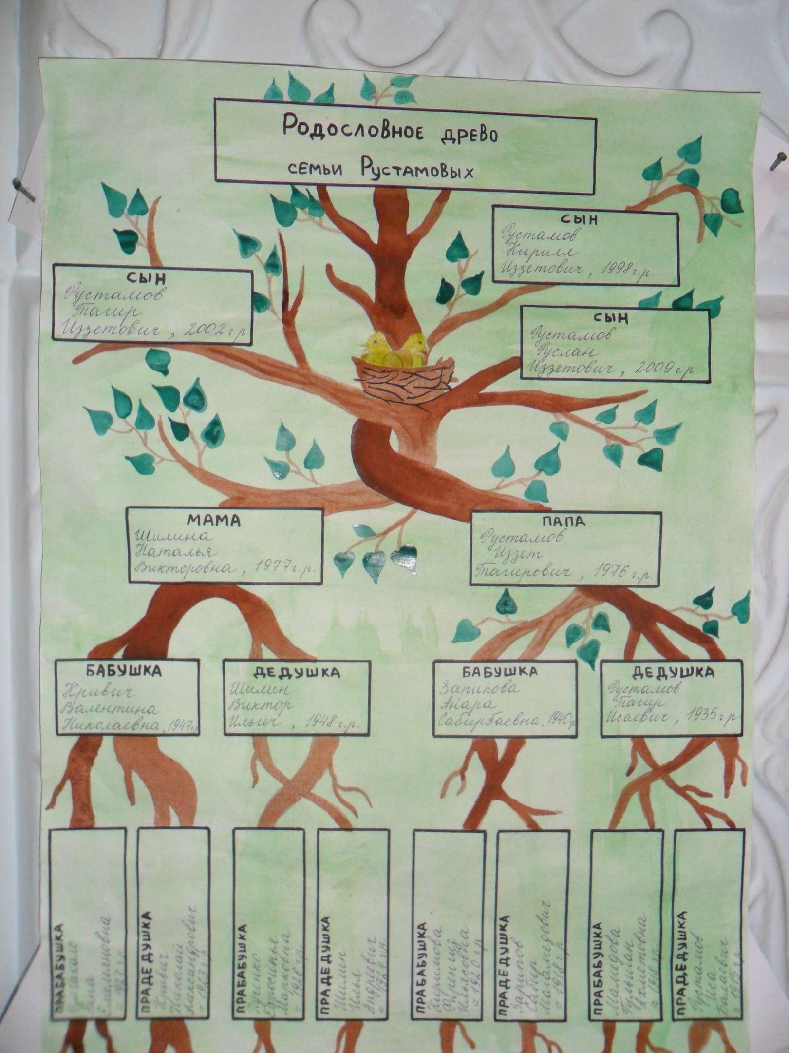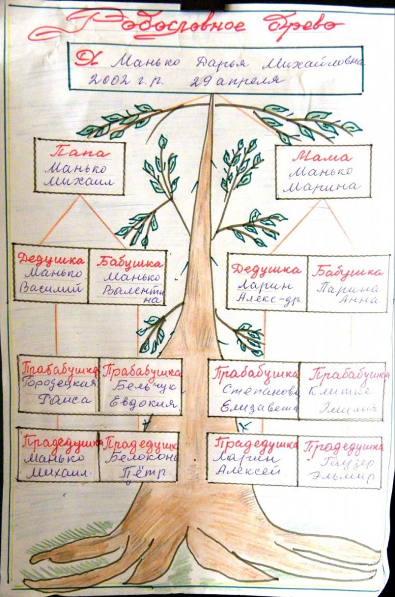 Le projet le plus volumineux, contenant les informations les plus complètes et les plus intéressantes sur les parents et les liens familiaux. Pour réaliser une telle idée, vous devrez faire des recherches approfondies et trouver le plus grand nombre possible de faits intéressants sur vos parents proches ou éloignés.