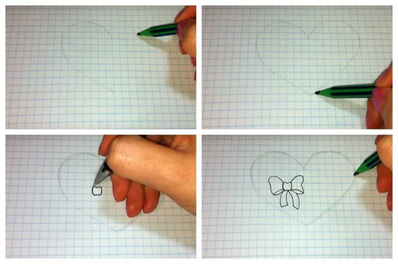 - Un cœur est dessiné entre les deux jambes supérieures, vous pouvez utiliser la méthode du tic-tac pour le rendre régulier. Mais pour cela, vous devez d'abord prendre une feuille de cahier.