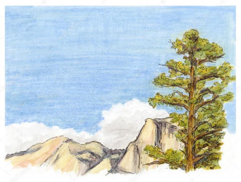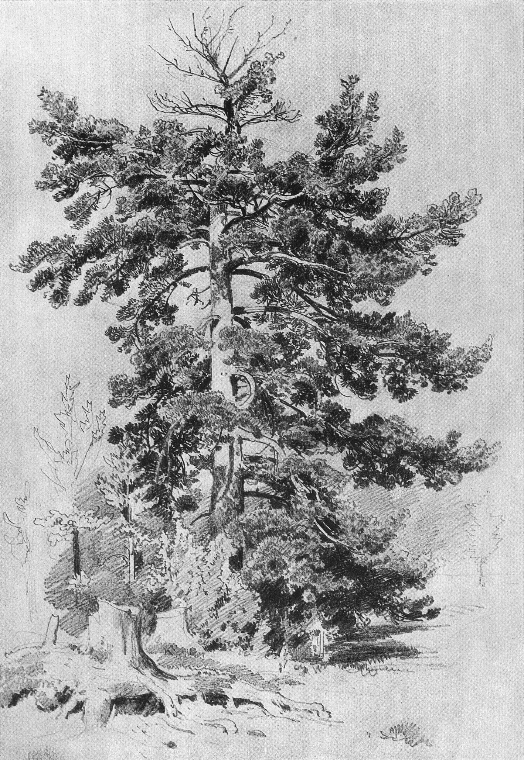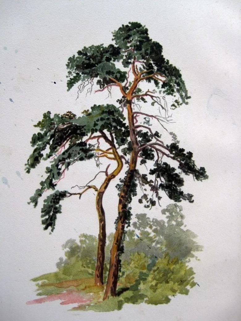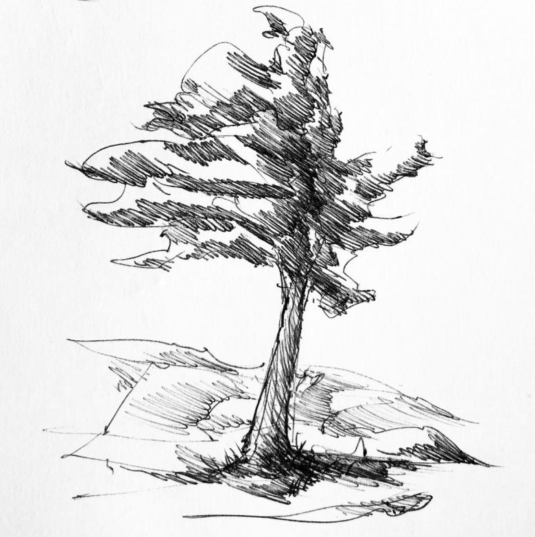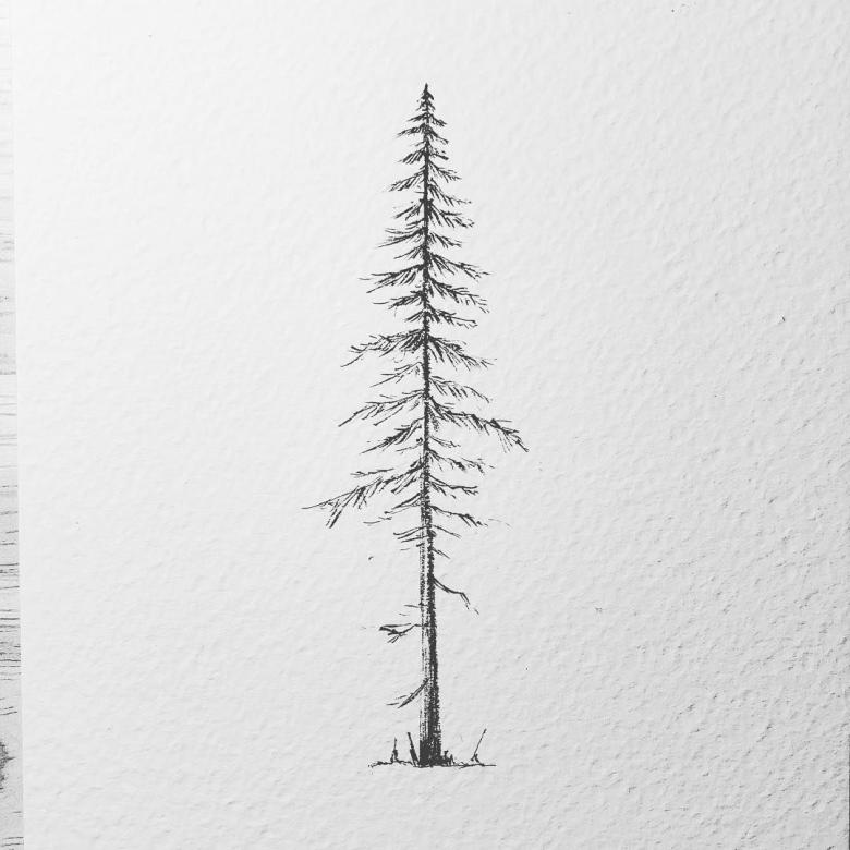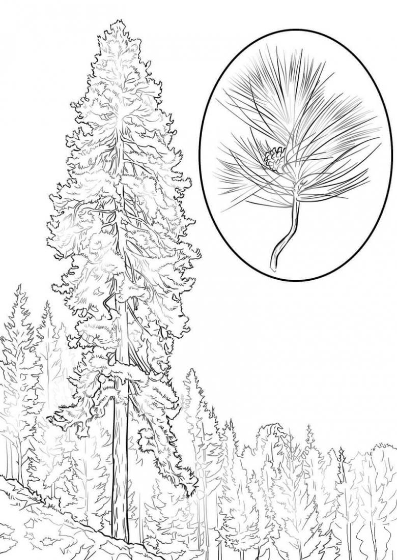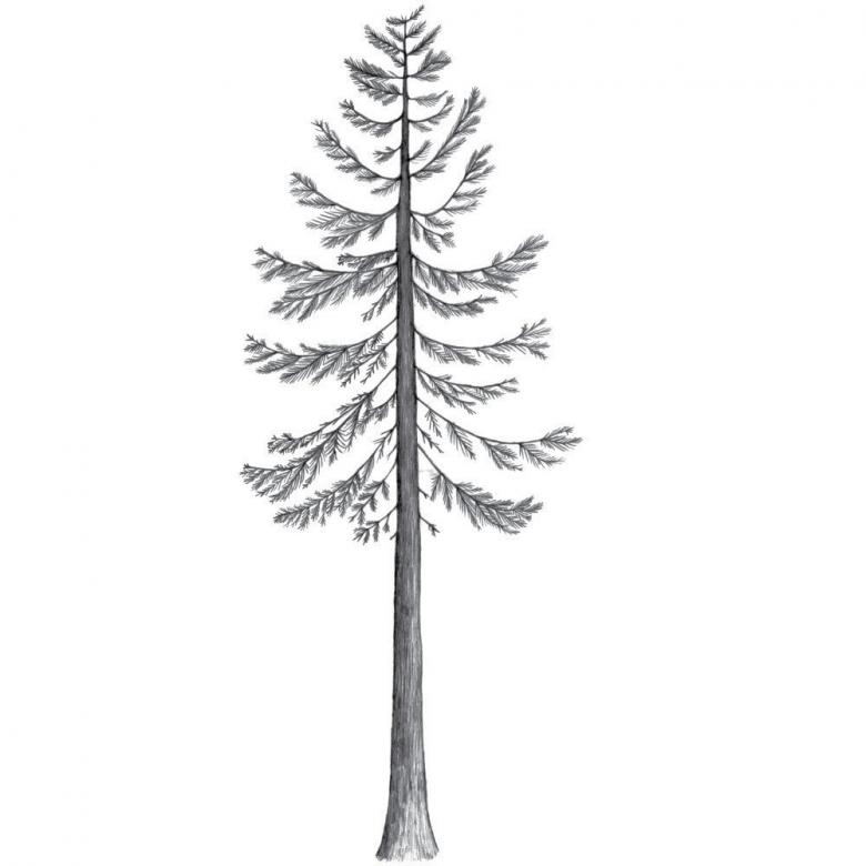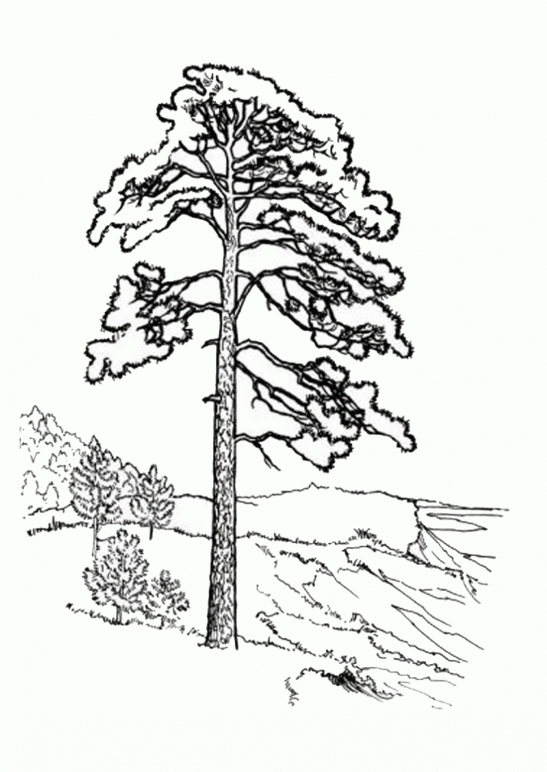 - Un pin a un tronc droit et haut qui s'incurve vers le sommet. Dans le dessin, elle est représentée comme étant mince.